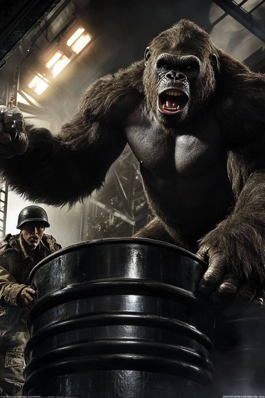 epic fight, low angle shot, King Kong is throwing the black steel barrel bomb to soldiers while climbing the ladder to the top,The soldier wearing in red is dodge the barrels from the kong, the barrels is in motion blurred to the camera --chaos 10 --ar 2:3 --style raw --sref 4121726804 --sw 200 --stylize 150 --v 6.1