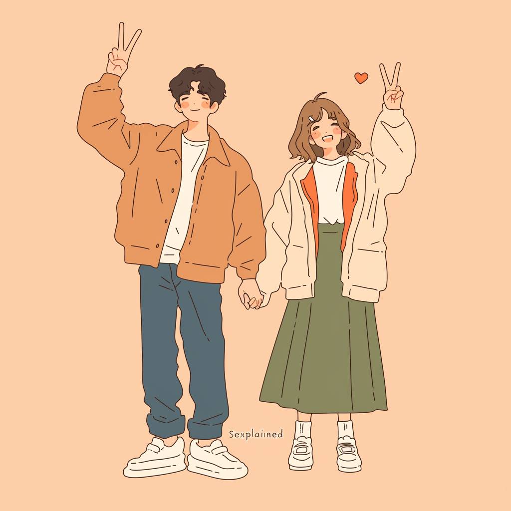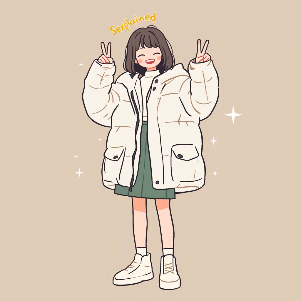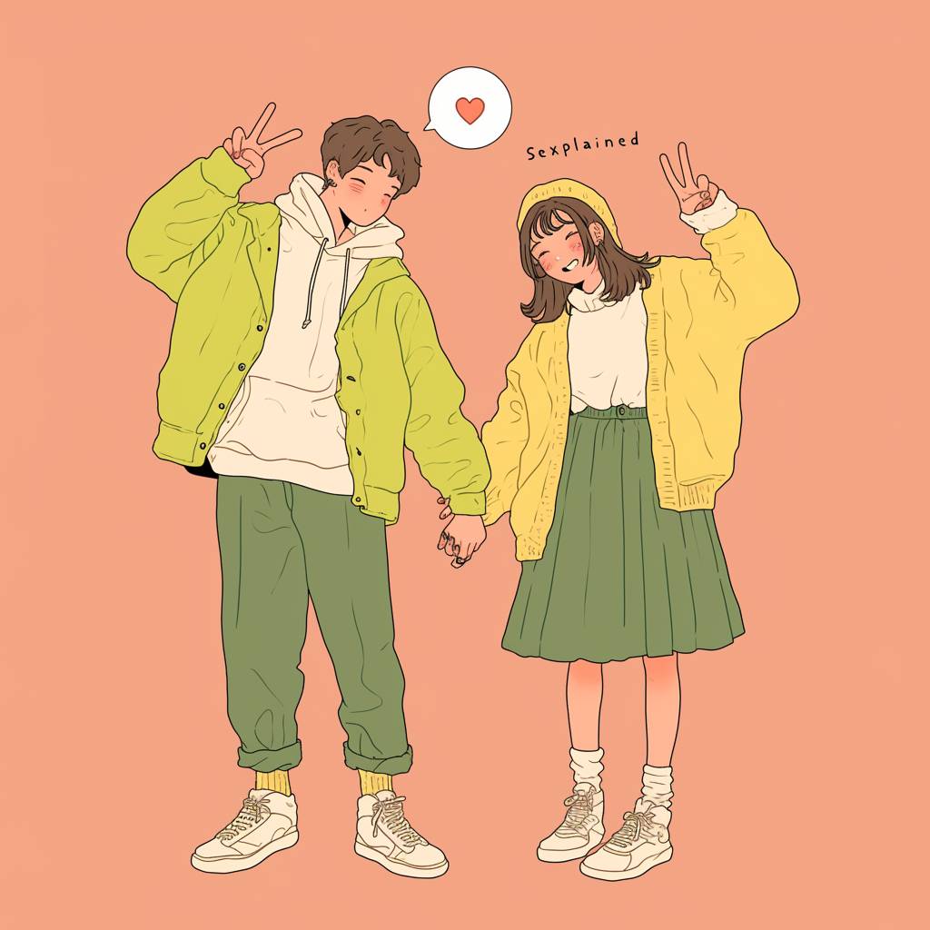 A cute girl wearing an oversized jacket, holding hands and making the peace sign with their fingers, smiling happily at each other. The girl wears green skirt and white sneakers, clip art style with simple flat colors and bold lines, simple color palette, vector illustration, low detail background, minimalistic, Korean webtoon style, pastel tone, simple details. "Sexplained" text on top of his head for title --style raw --stylize 50 --niji 6