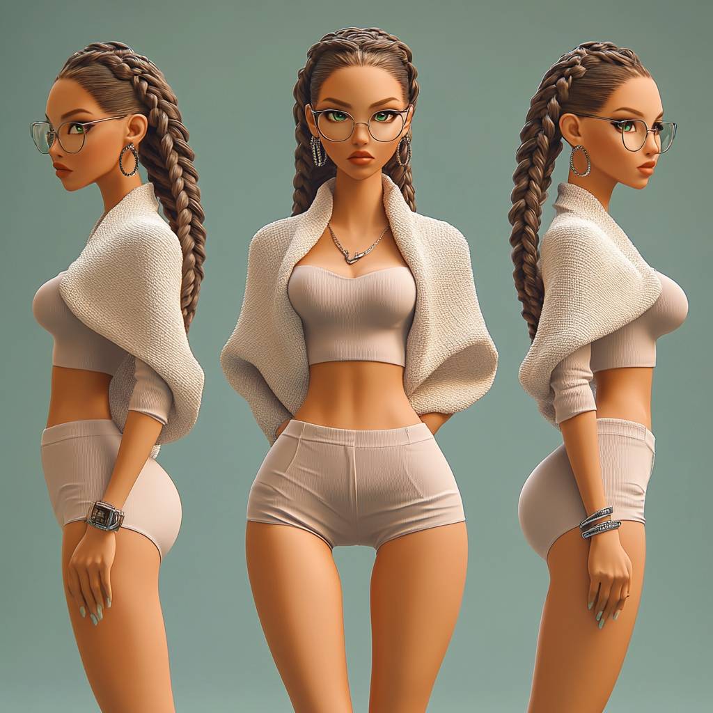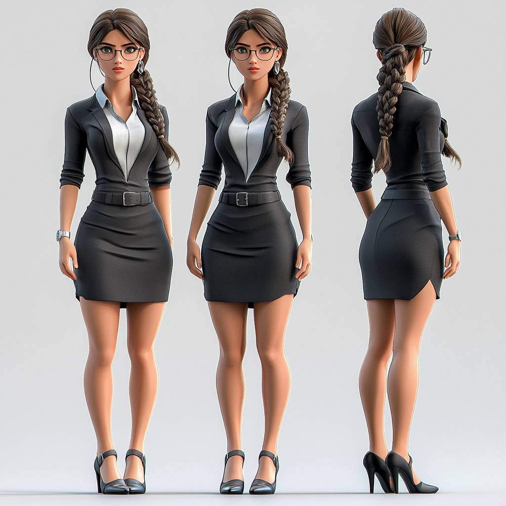 全身,生成三個視圖:正面視圖,側面視圖和背面視圖,乾淨的背景,3D 渲染,OC 渲染,最佳質量,4K,超細節,POP市場玩具,工作室照明,1名女性,辦公室女性(OL),透明哑光緊身裙,肩長辮子髮,棕色頭髮,(時尚:1.1),絲綢披肩披在肩上,銀色半邊框眼鏡,(優雅:1.2),棕綠色亮眼,(淡妝:0.8),(海軍藍淚滴耳環:1.3),專業服裝,俐落外觀,(現代城市景觀:1.2),城市背景,(柔和燈光:1.0),精緻細節,精緻妝容,中性表情,自信姿態,(高跟鞋:1.3),(配飾:珠寶或手錶:0.9),(專注於主題:1.4)。