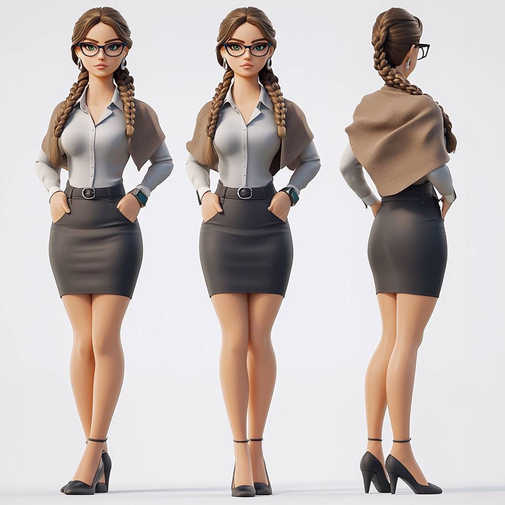 Full body, generating three views: front view, side view, and back view, clean background, 3D rendering, OC rendering,l best quality, 4K, super detail, POP market toy, studio lighting ,1 woman, office lady (OL), sheer matte bodycon skirt, shoulder-length braided hair, brunette hair color, (fashionable:1.1), silk shawl draped over shoulders, silver half-rim glasses, (elegant:1.2), brown-green iridescent eyes, (subtle makeup:0.8), (navy blue teardrop earrings:1.3), professional attire, sleek appearance, (modern cityscape:1.2), urban backdrop, (subtle lighting:1.0), refined details, polished makeup, neutral expression, confident stance, (high heels:1.3), (accessories: jewelry or watch:0.9), (focus on subject:1.4). --v 6.1