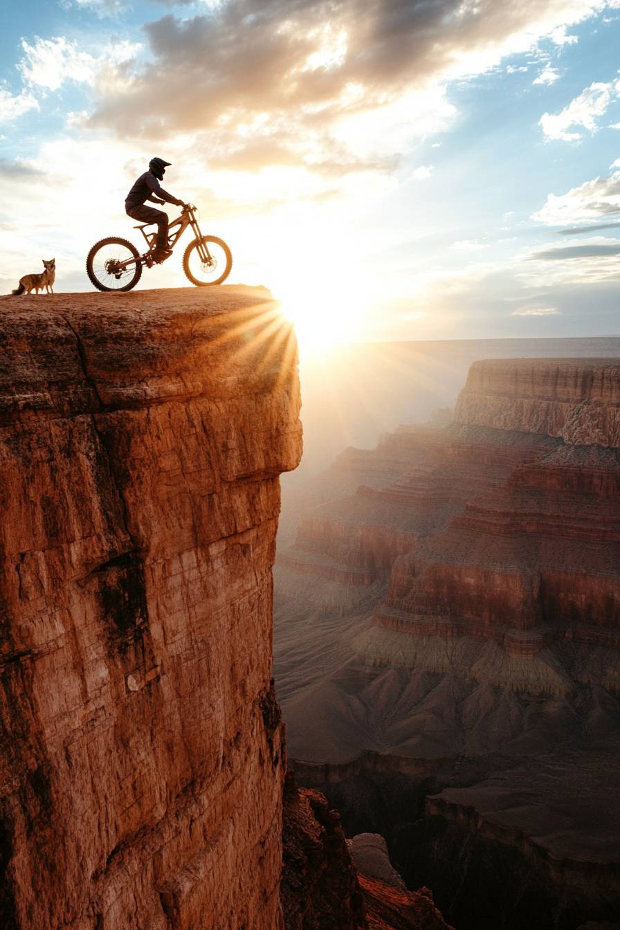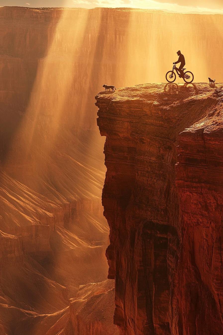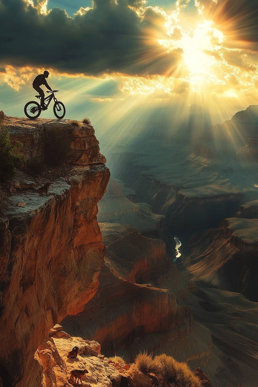 Grand Canyon desert, man rising motocross bike on edge of a cliff, surrounded by coyotes, sun rays, --ar 2:3 --v 6.1