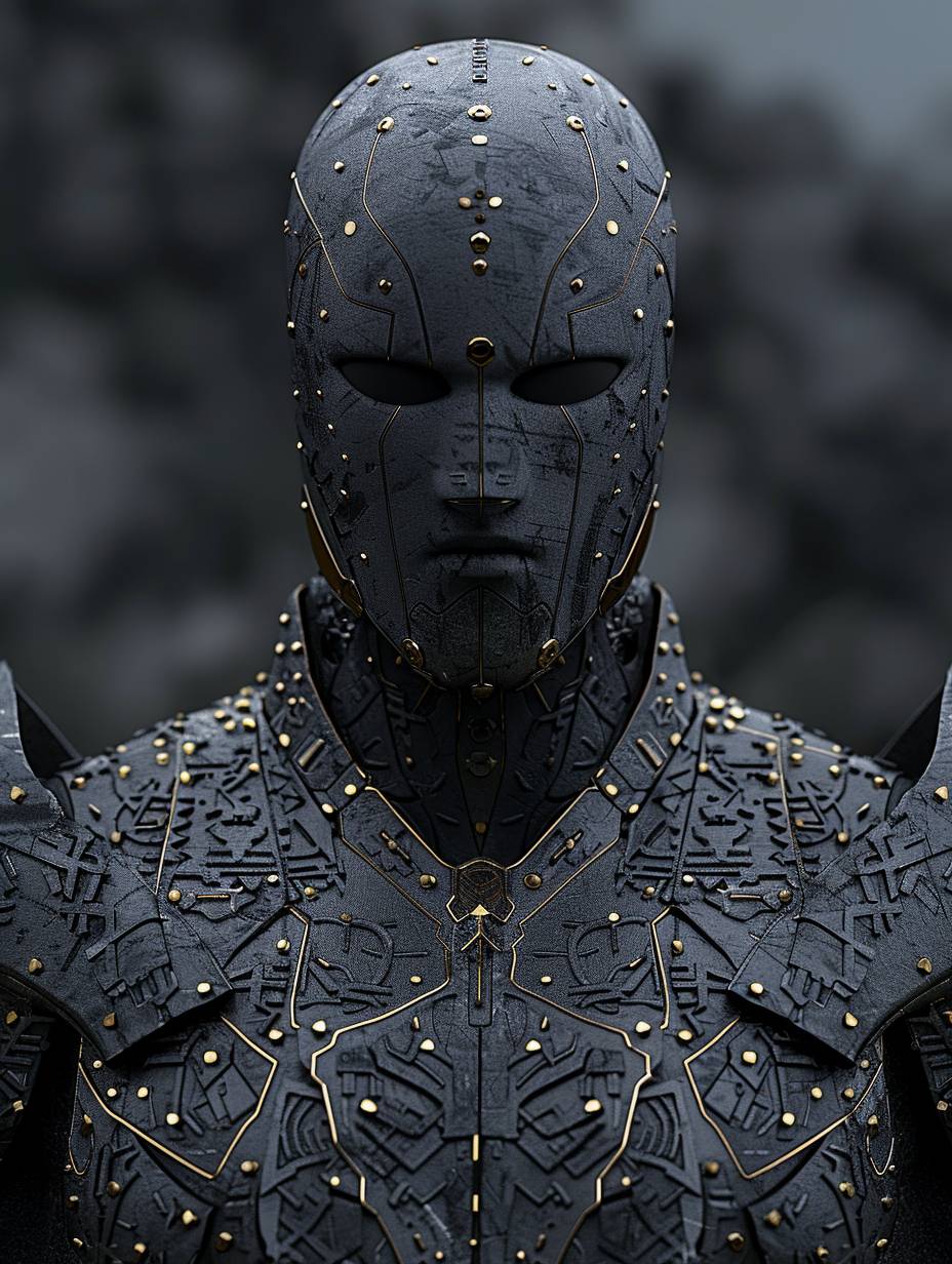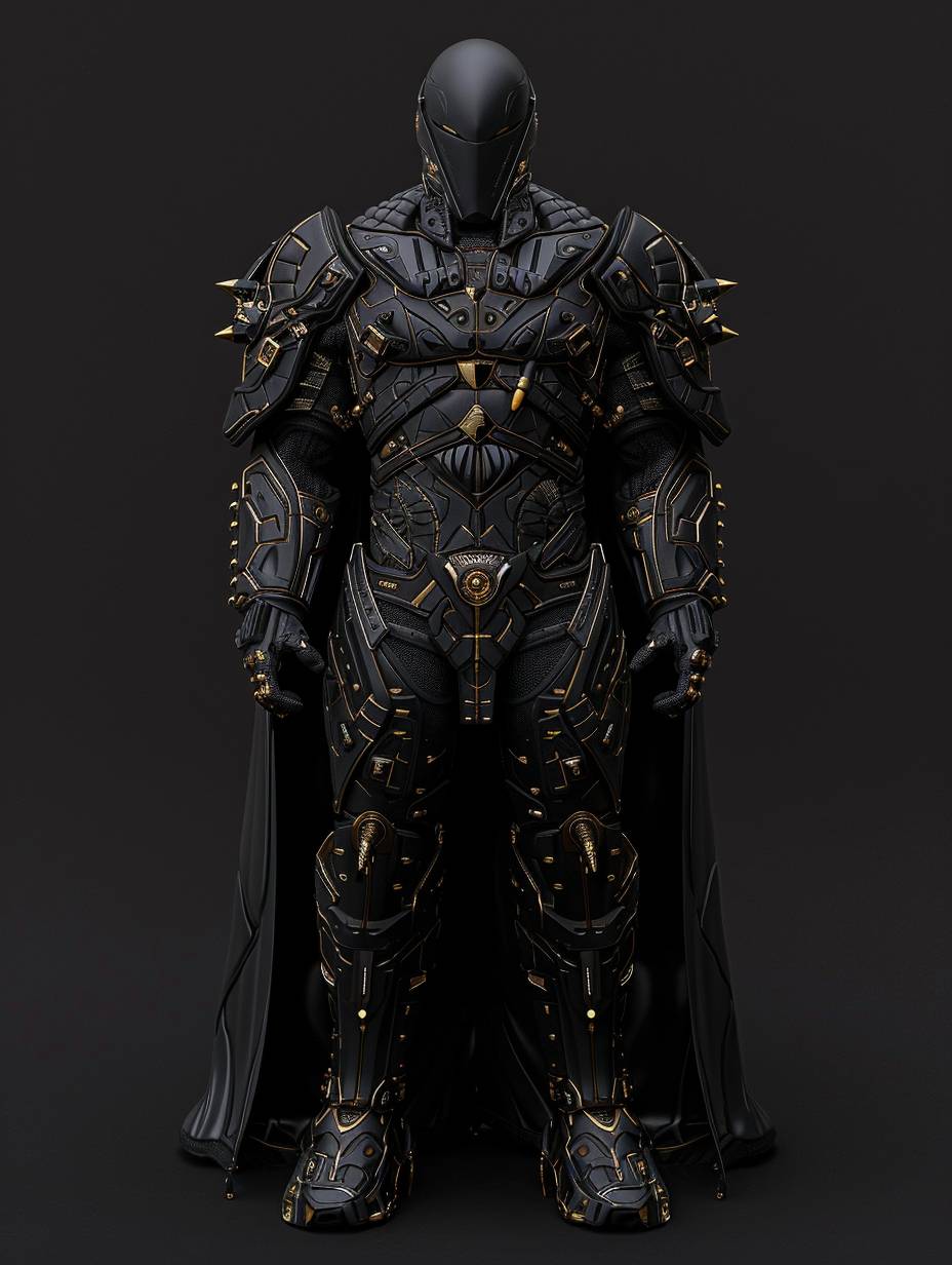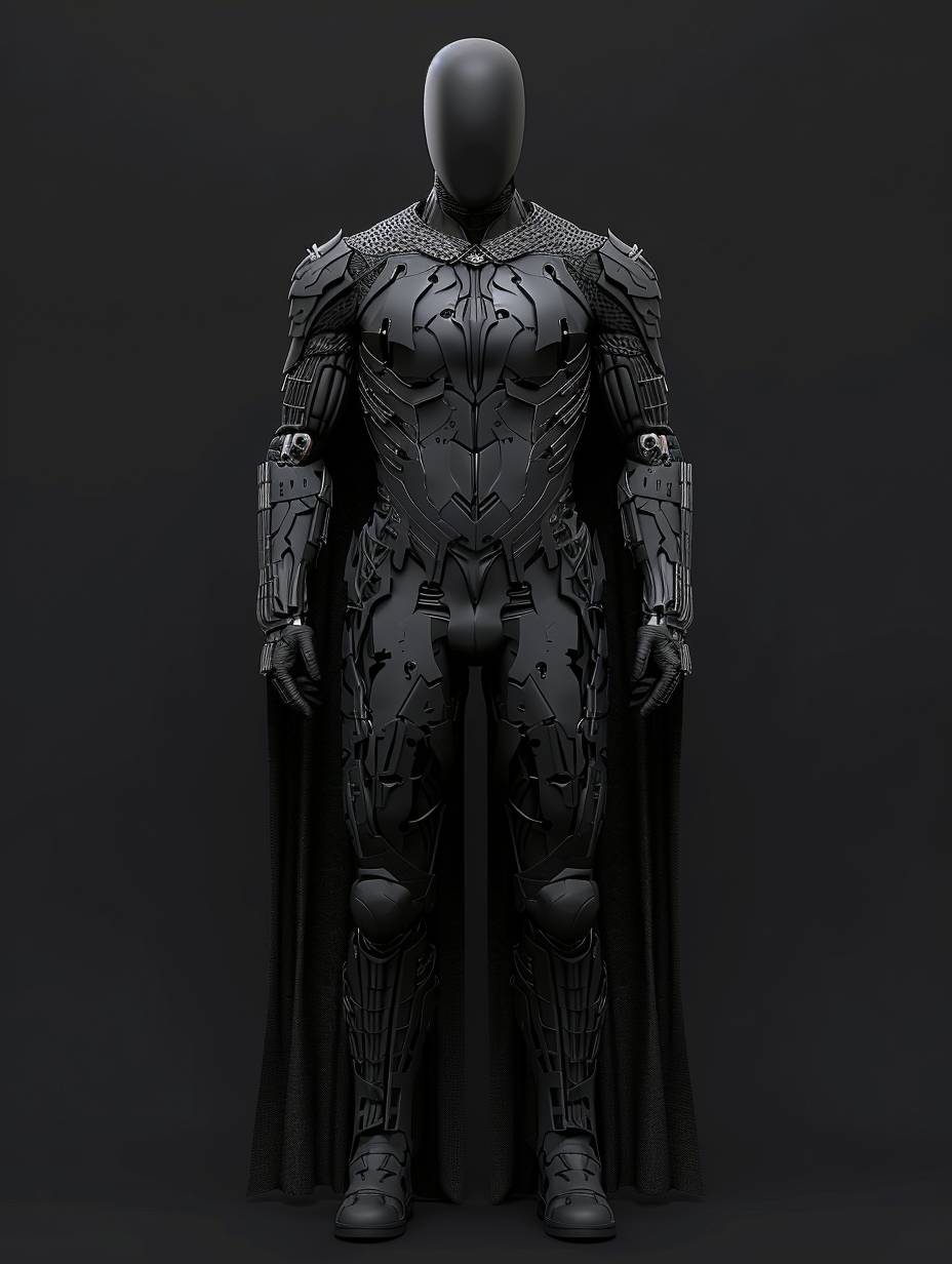 攝影,全身,具備大型體格的賽博朋克角色,金屬肌肉手臂。禿頭機械人頭,胸部及機械手臂上有鉻鋼板,直立站立,動漫風格設計,以吉田明彥的風格,黑色工作室背景,角色設計,電影靜幀