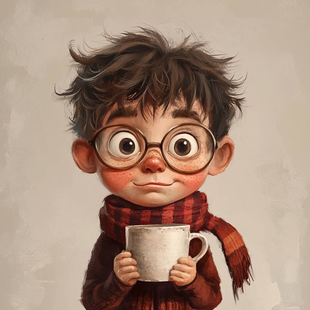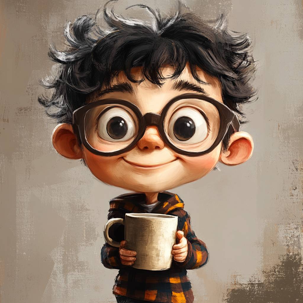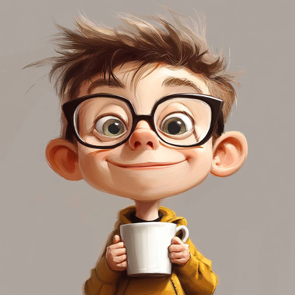 小年輕的老男孩,卡通風格,手拿咖啡杯