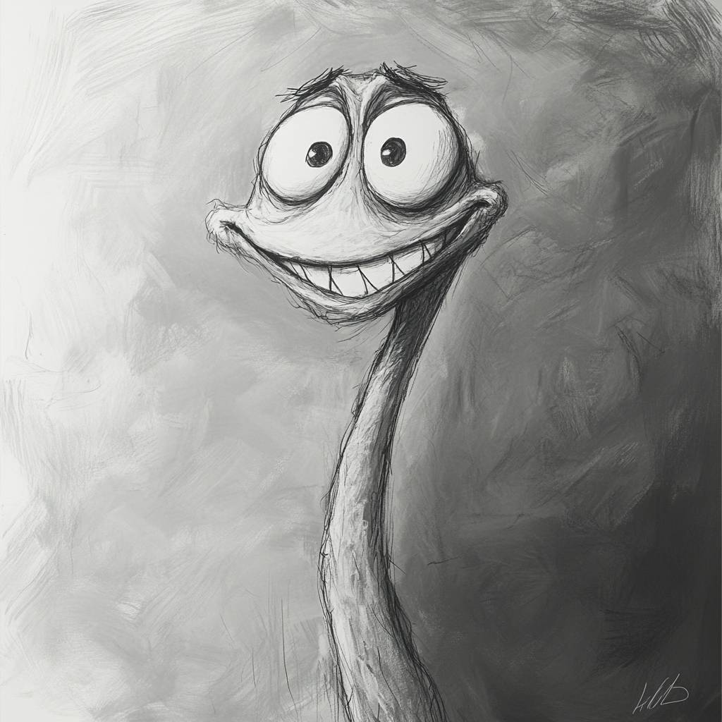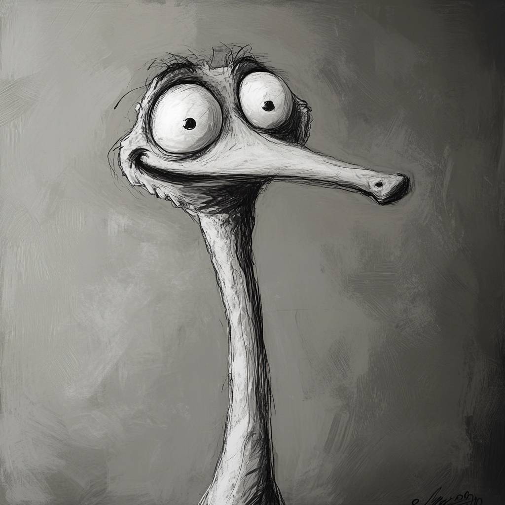 一隻脖子極長的[動物]正在把[他的/她的]頭往後仰,以展示它的長度。這幅圖是一幅漫畫風格的畫,背景是灰色的,低角度拍攝,表現出一個詭異的微笑和睜大的眼睛。