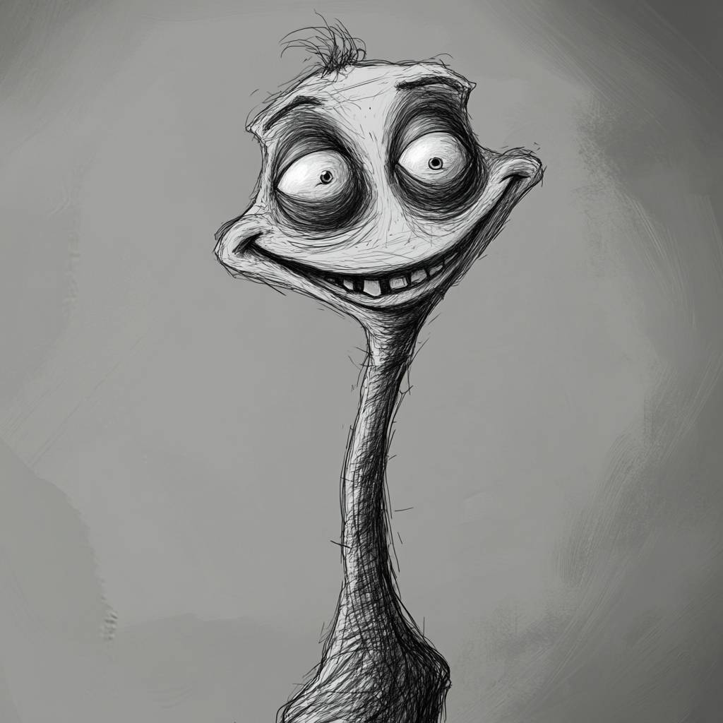 A [SUBJECT] with an extremely long neck is pulling [his/her] head back to show off the length of it. The drawing is a caricature with a creepy smile and wide-open eyes against a grey background, shot from a low angle. --v 6.1