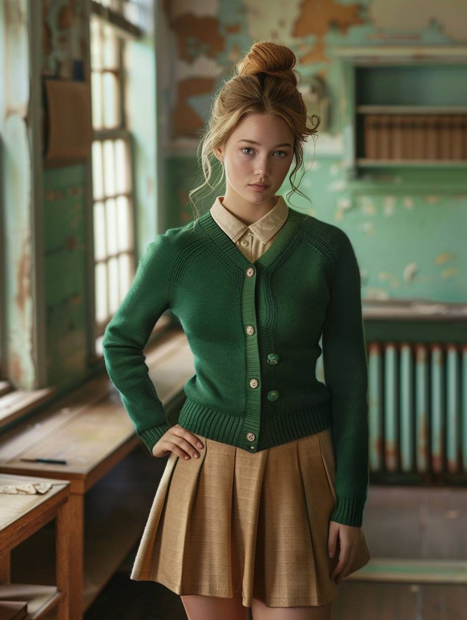 詹妮弗·羅倫斯在學校穿著緊身開衫的造型手冊,開衫全扣,圓領,綠色開衫,裙子和長襪,運動鞋,金色盤髮,明亮背景,全身肖像。