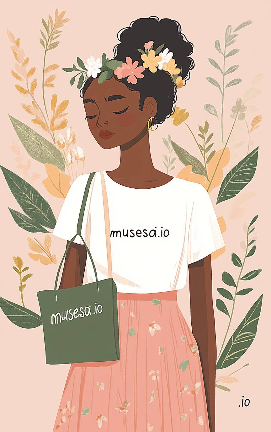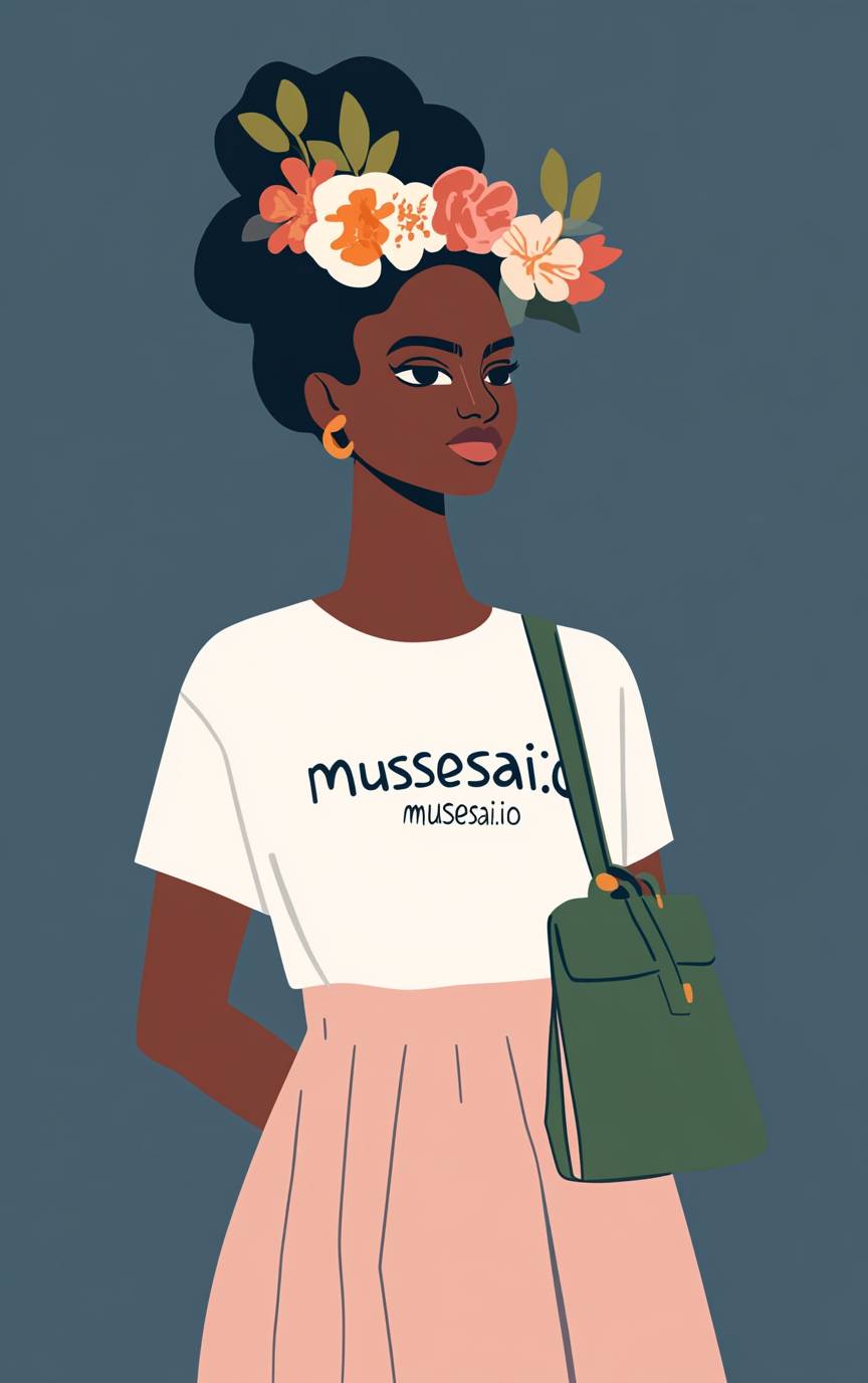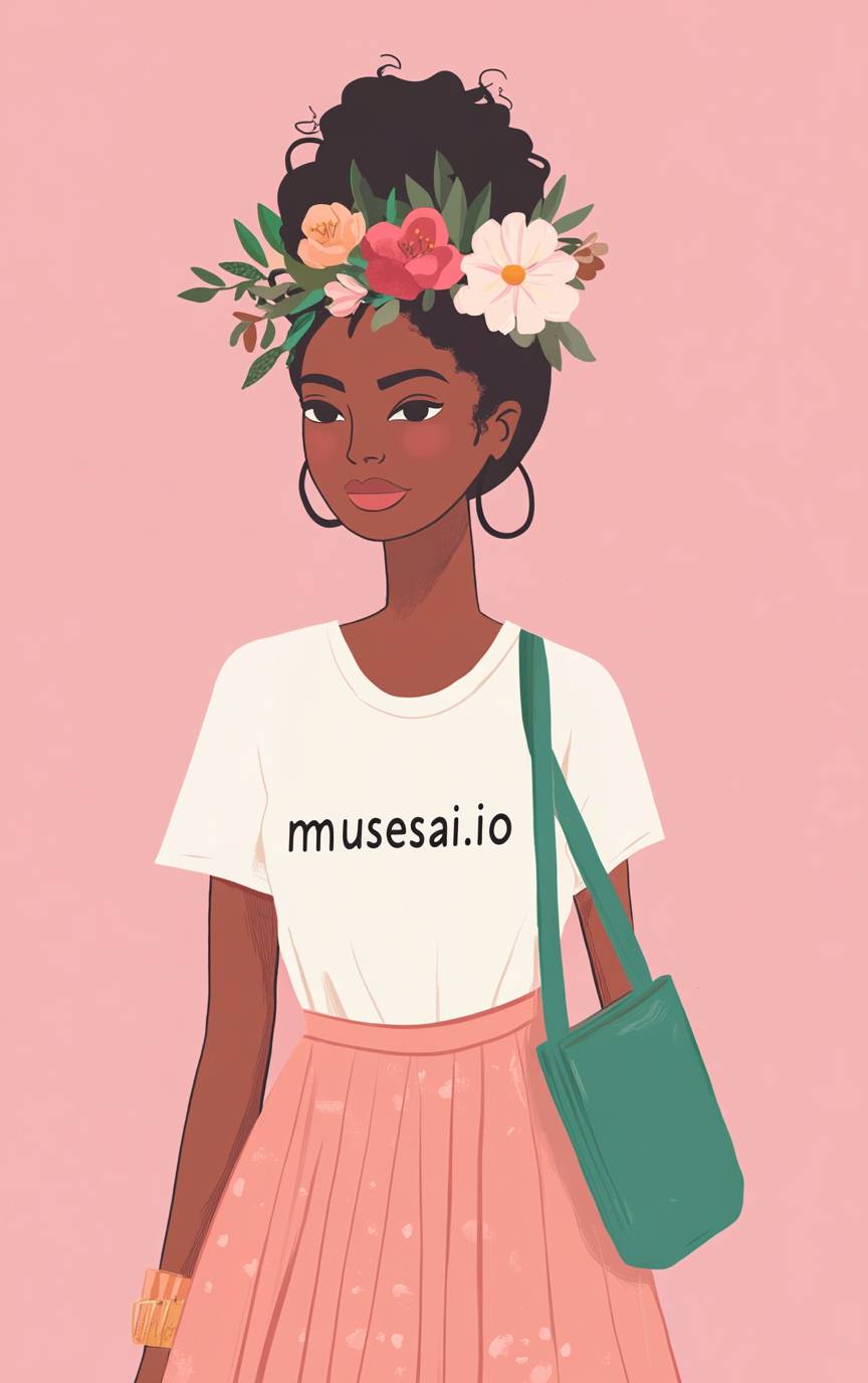 一幅平面插圖,描繪了一位身穿印有「musesai.io」字樣白色T恤的非洲裔美國女性,搭配粉色裙子和綠色手袋,髮髻中插有花朵。風格受馬蒂斯啟發,使用了柔和的色彩調色板,顏色沉靜,形狀簡約。