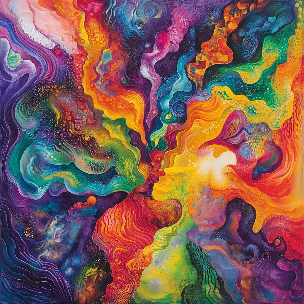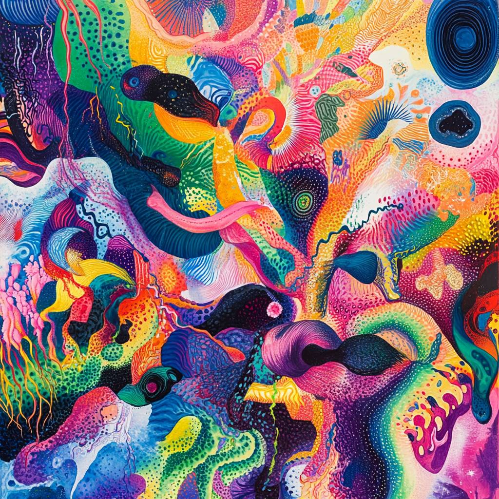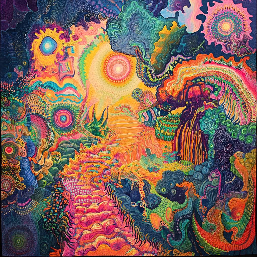 A Psychedelic Reverie of [SUBJECT], with swirling patterns and vibrant hallucinations, dominated by the mesmerizing hues of [COLOR1] and [COLOR2]