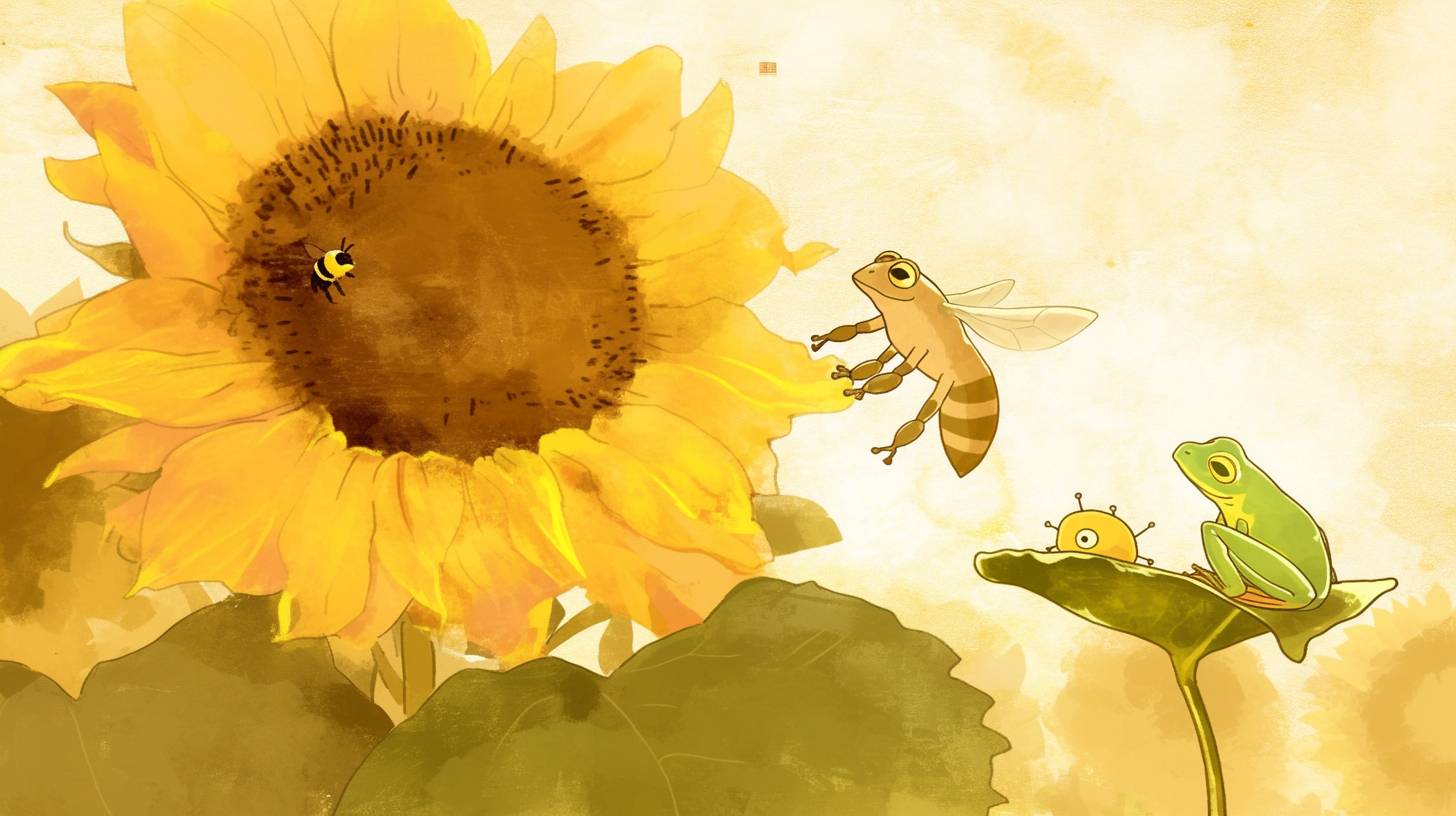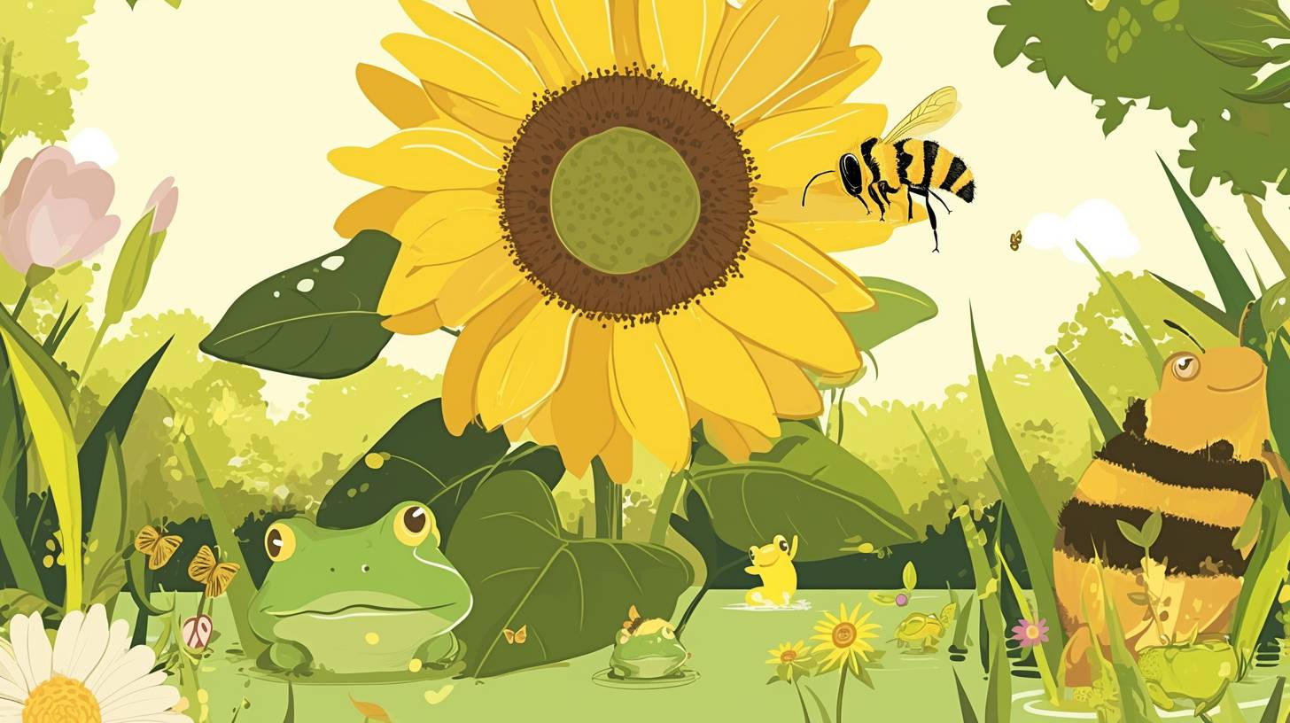 兒童畫:向日葵上的蜜蜂或池塘裡的青蛙