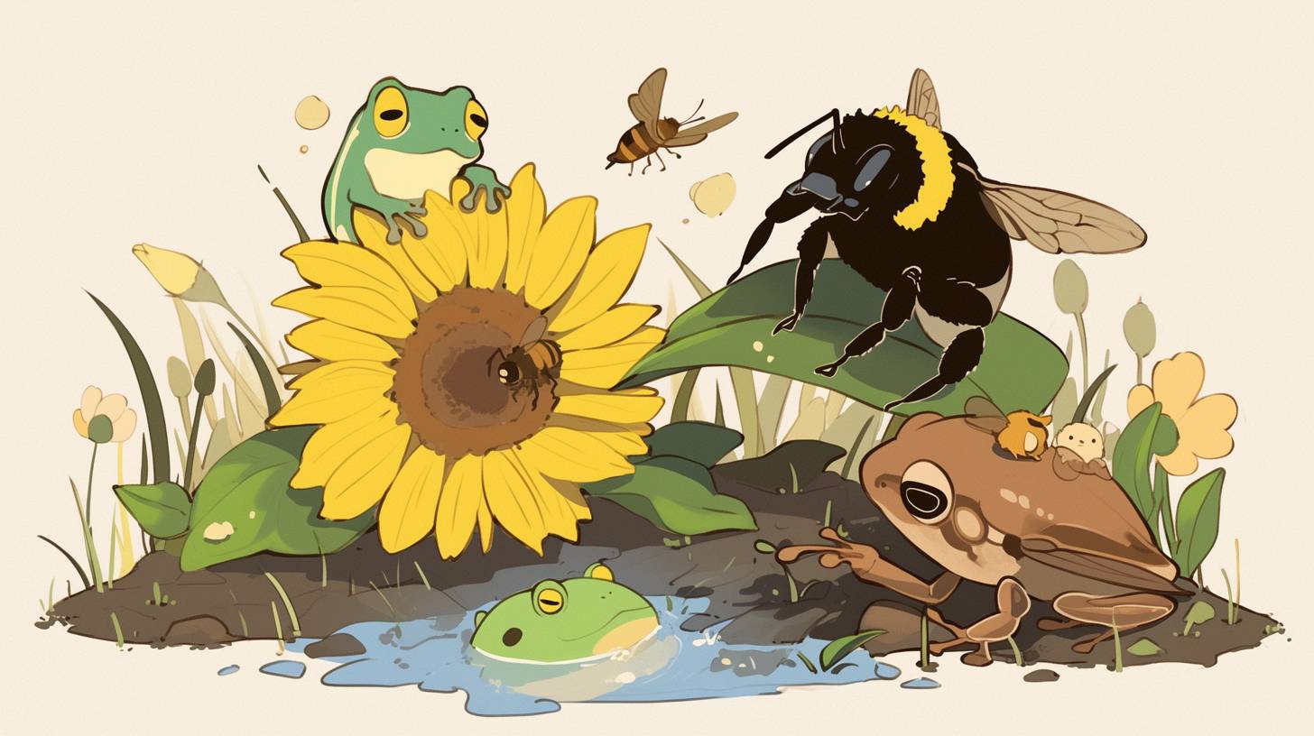 children's drawing of [a bee on a sunflower, a frog in a pond or whatever] --ar 16:9 --niji 6 --style raw