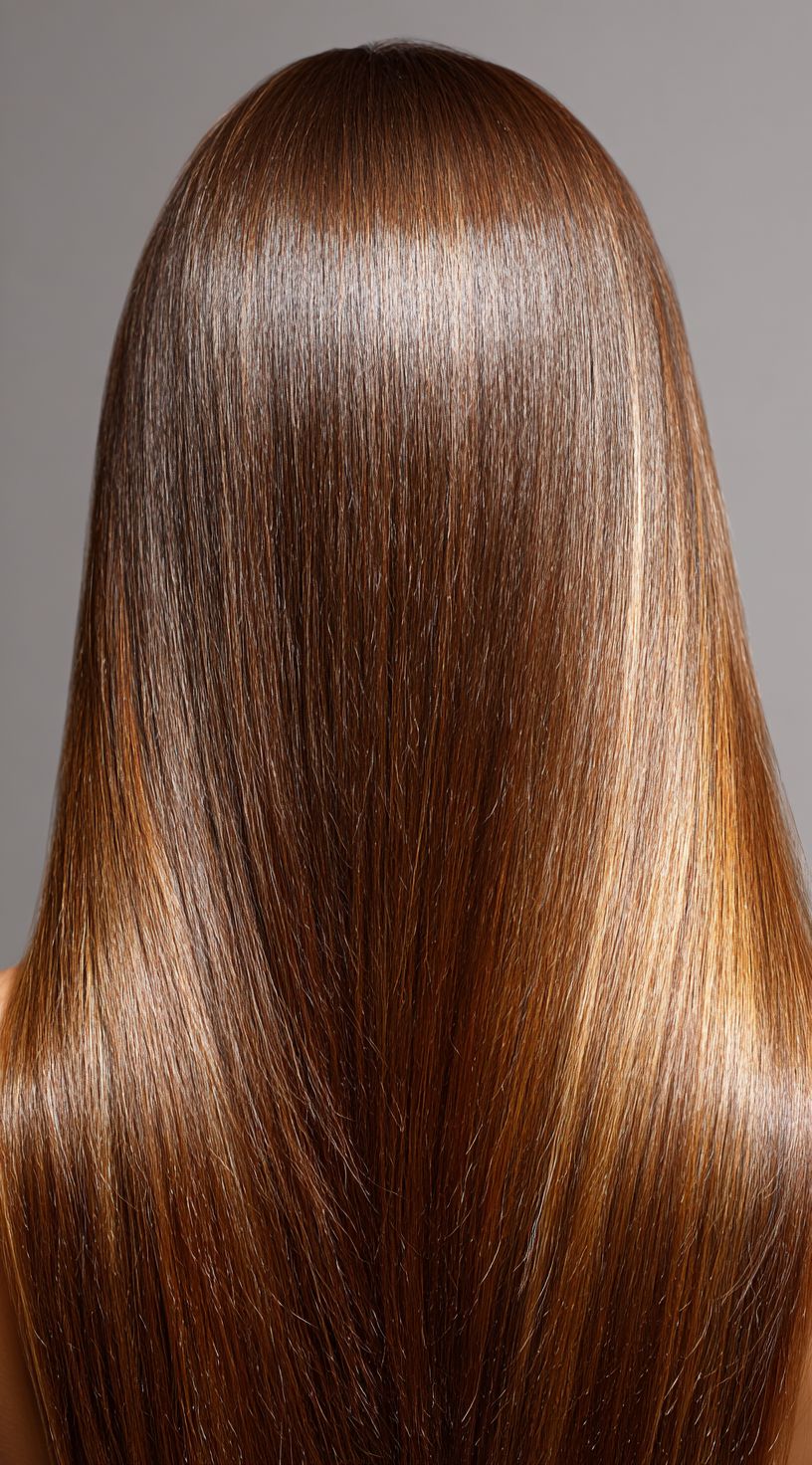 一頭光滑、有光澤的頭髮特寫,帶有自然的高光,展示了一款長直棕色髮型的美麗和健康。背景是灰色的,突顯了髮色。