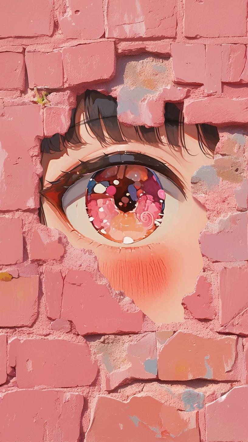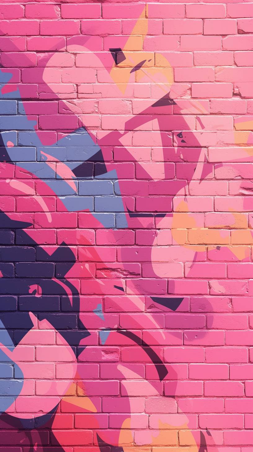 A pink brick wall with cute graffiti painted on it, colorful,cute,hyperrealistic illustration --ar 9:16 --niji 6