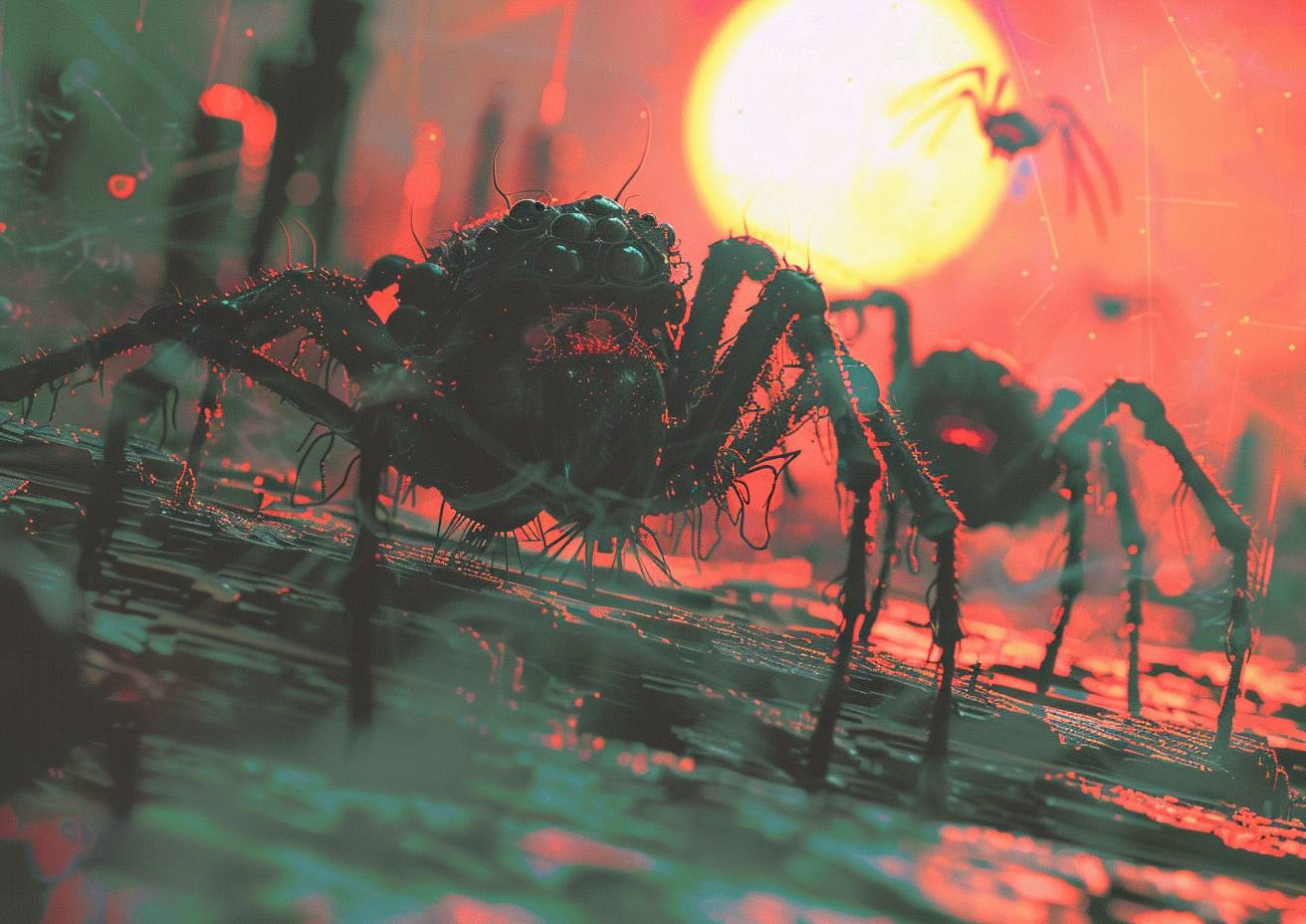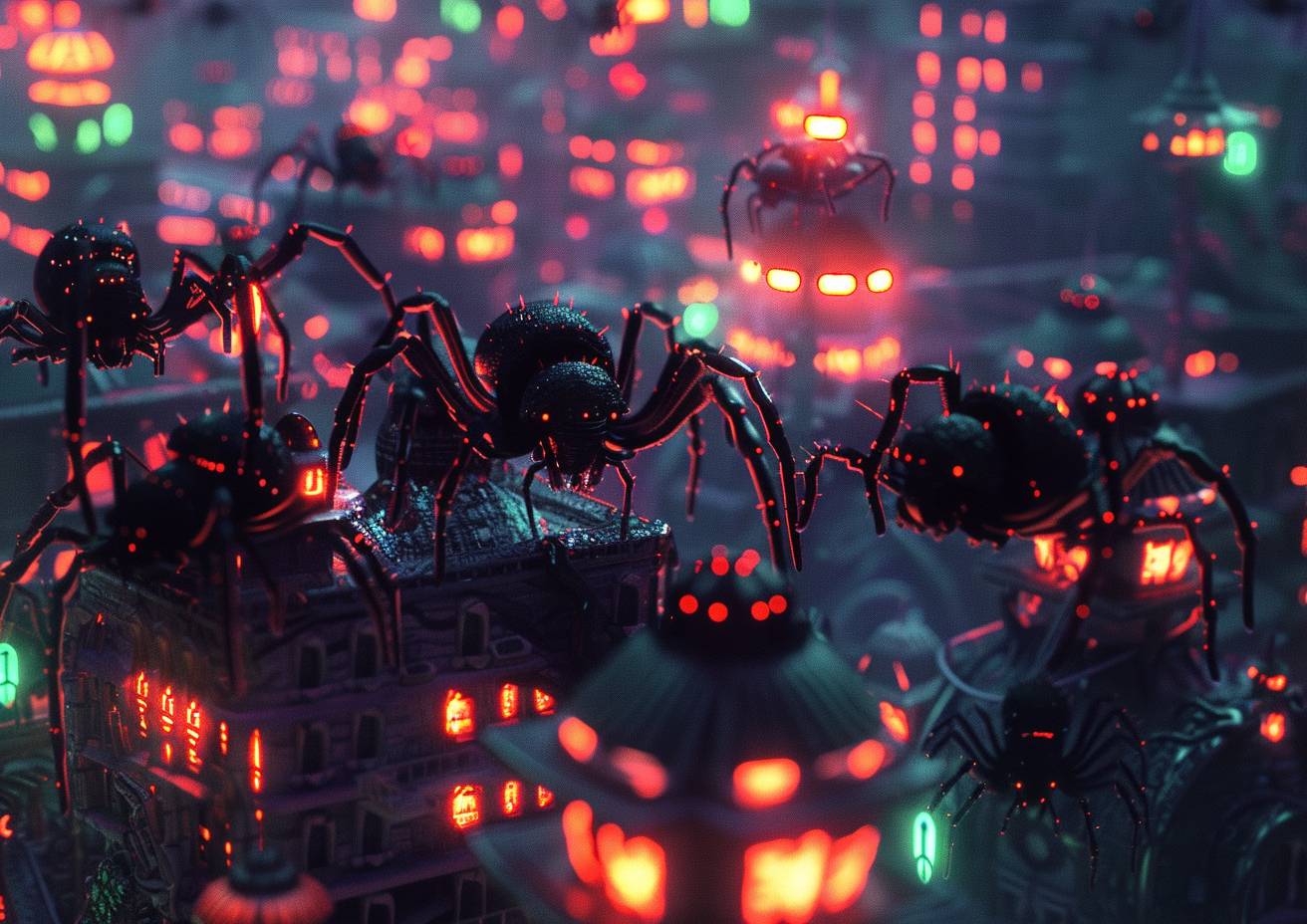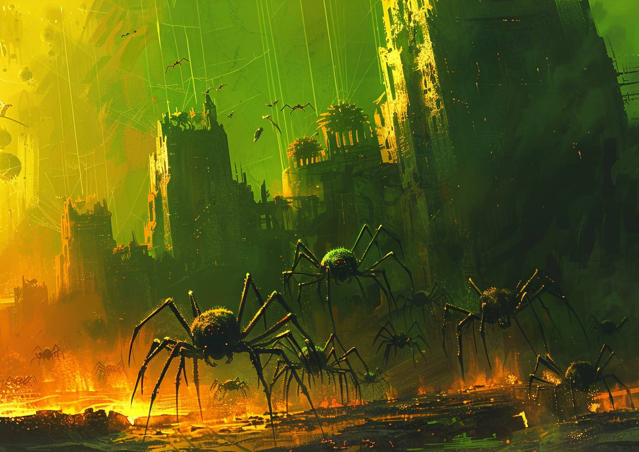 火星上乌黑恐怖的蜘蛛成群而至,呈现出可怕的故障朋克风格,铀玻璃和印加城市的强烈视觉效果。