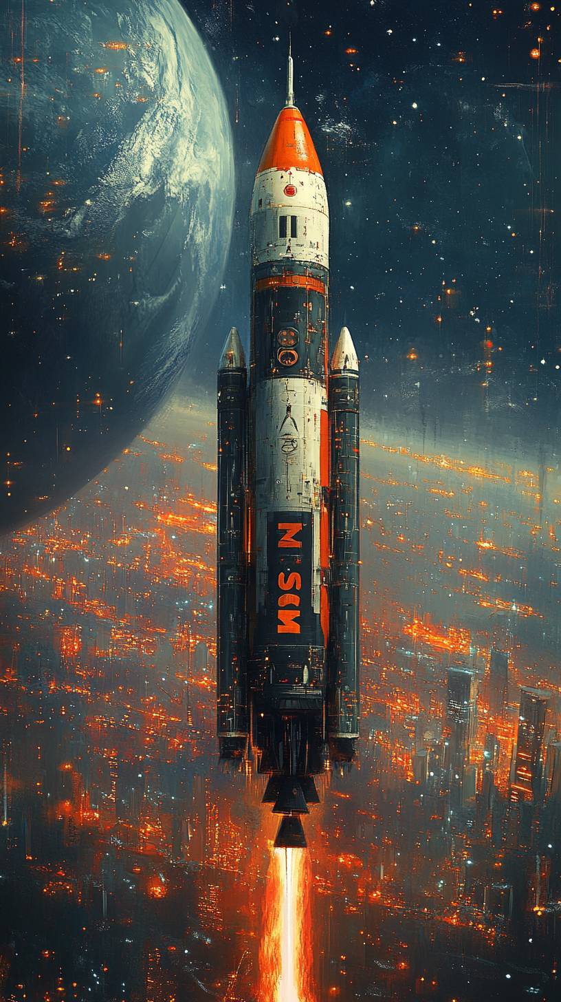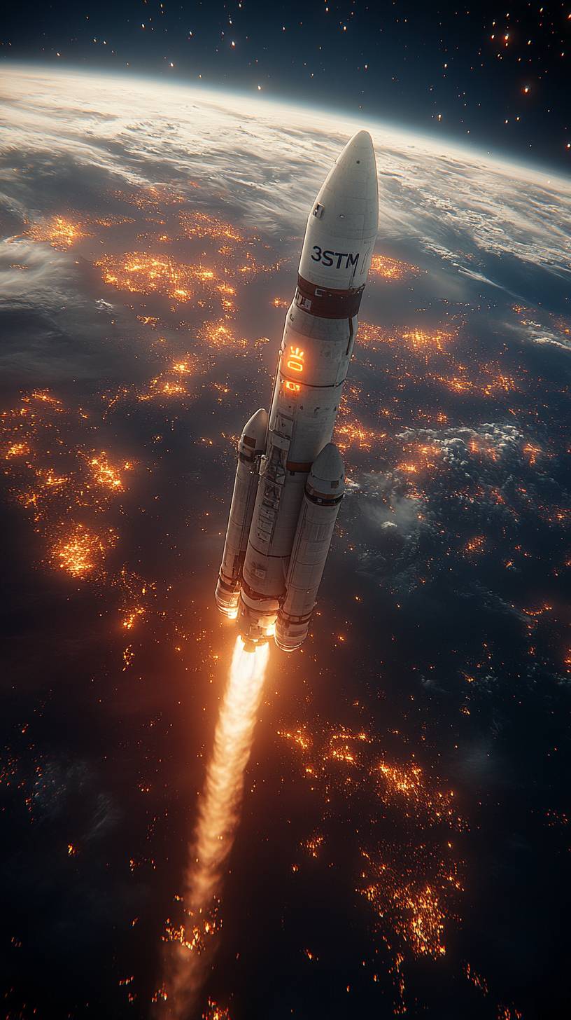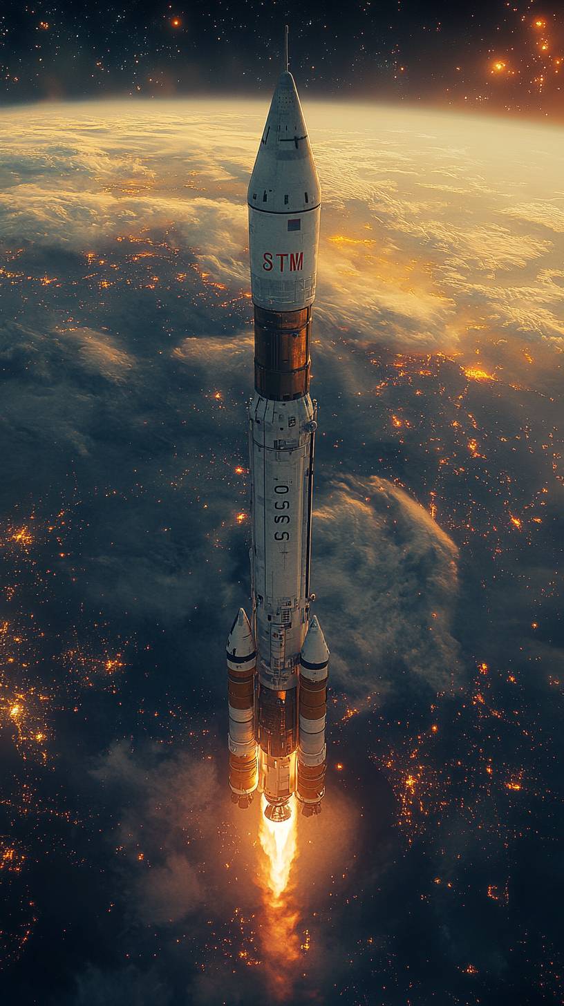 一枚在地球軌道上懸浮的火箭,側面寫着‘30STM’。場景發生在夜晚,地球在下面,閃耀的城市燈光,以及背景中浩瀚的星空。氣氛寧靜而雄偉,捕捉到宇宙旅行前的寧靜之美。