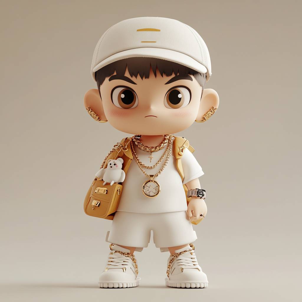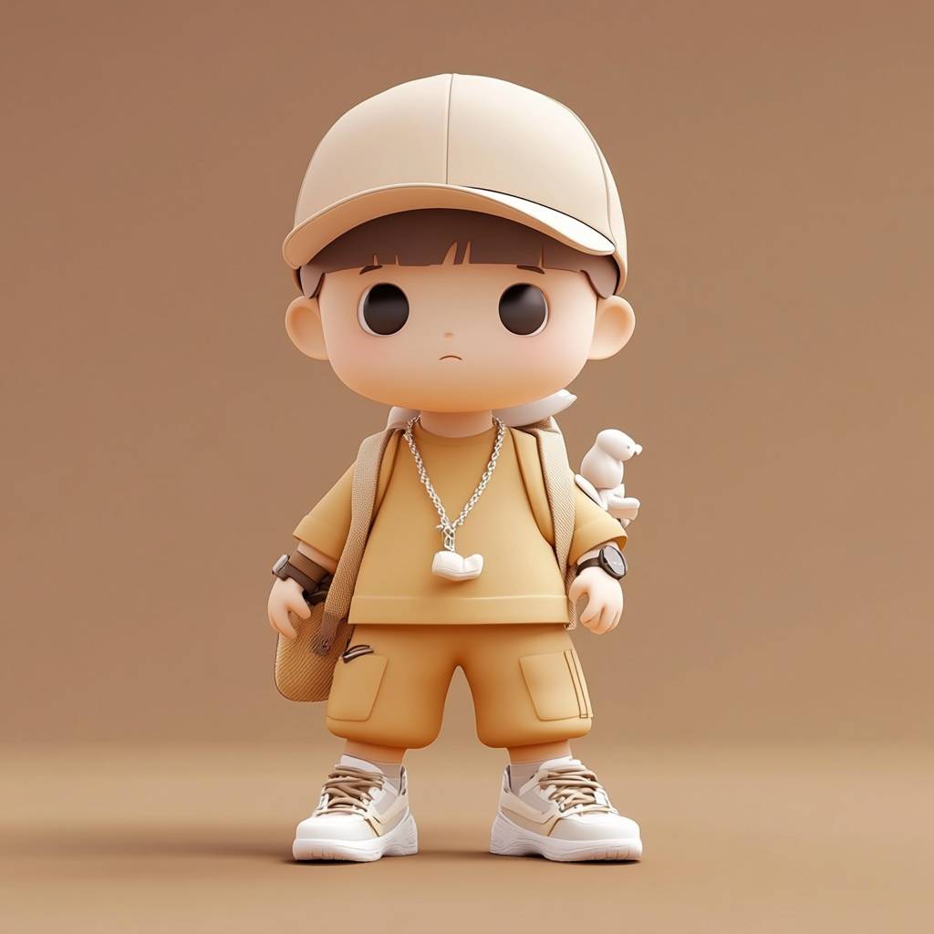 3D chibi cute man character, wearing white shoes, wearing a hat, wearing bag in shoulder, wearing a necklace around the neck, wearing a watch, flat background, UHD 3D Render --style raw --v 6.1