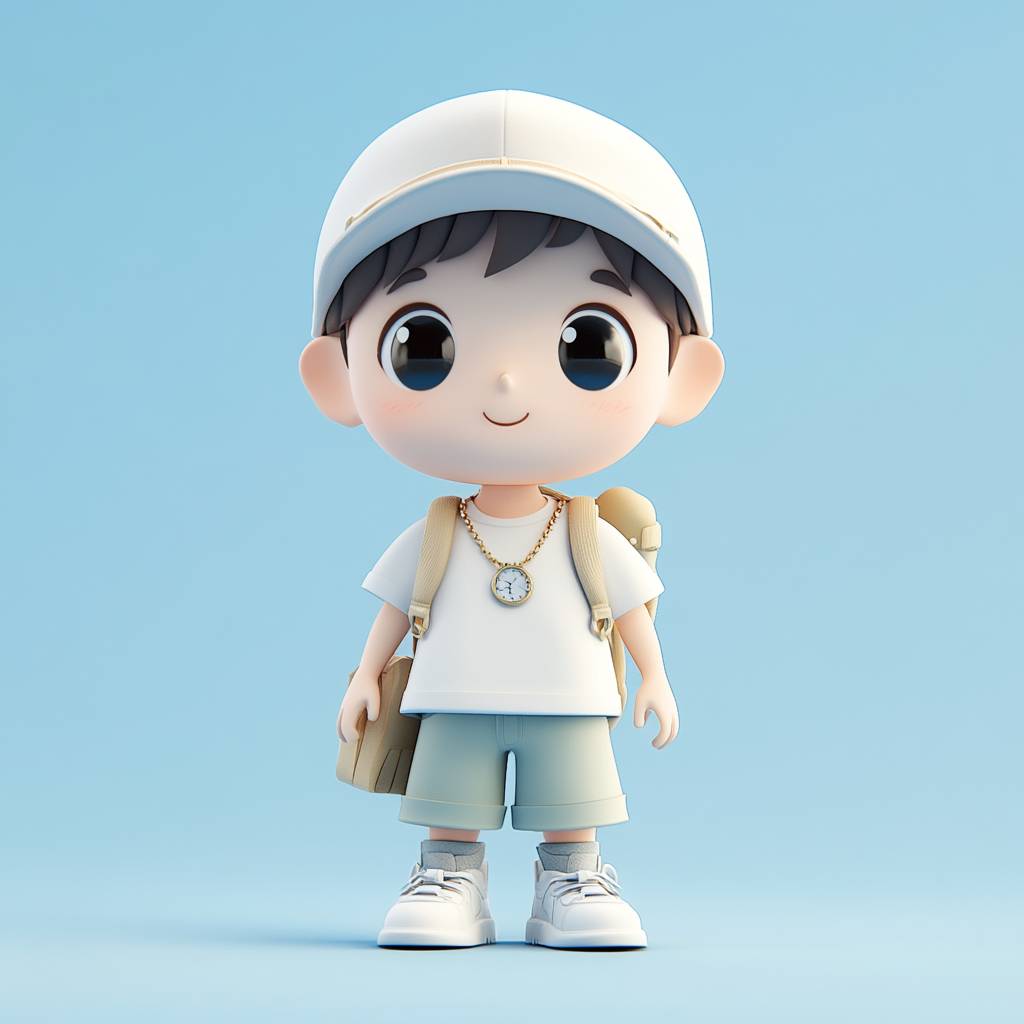 3D 可愛迷你型男性角色,穿著白色鞋子,戴著帽子,肩上背著包,脖子上戴著項鏈,手腕上戴著手錶,平面背景,超高清 3D 渲染