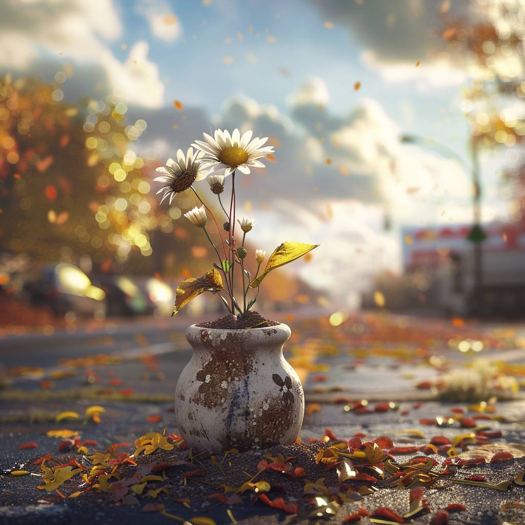 中景特寫,一個微小的花瓶裝滿泥土,裡面種著一朵美麗的雛菊,在荒廢城市的道路上沐浴在秋日陽光下,虛構,壁紙,角色,CG藝術作品,藝術,閃光攝影,真實照片,4K真實照片