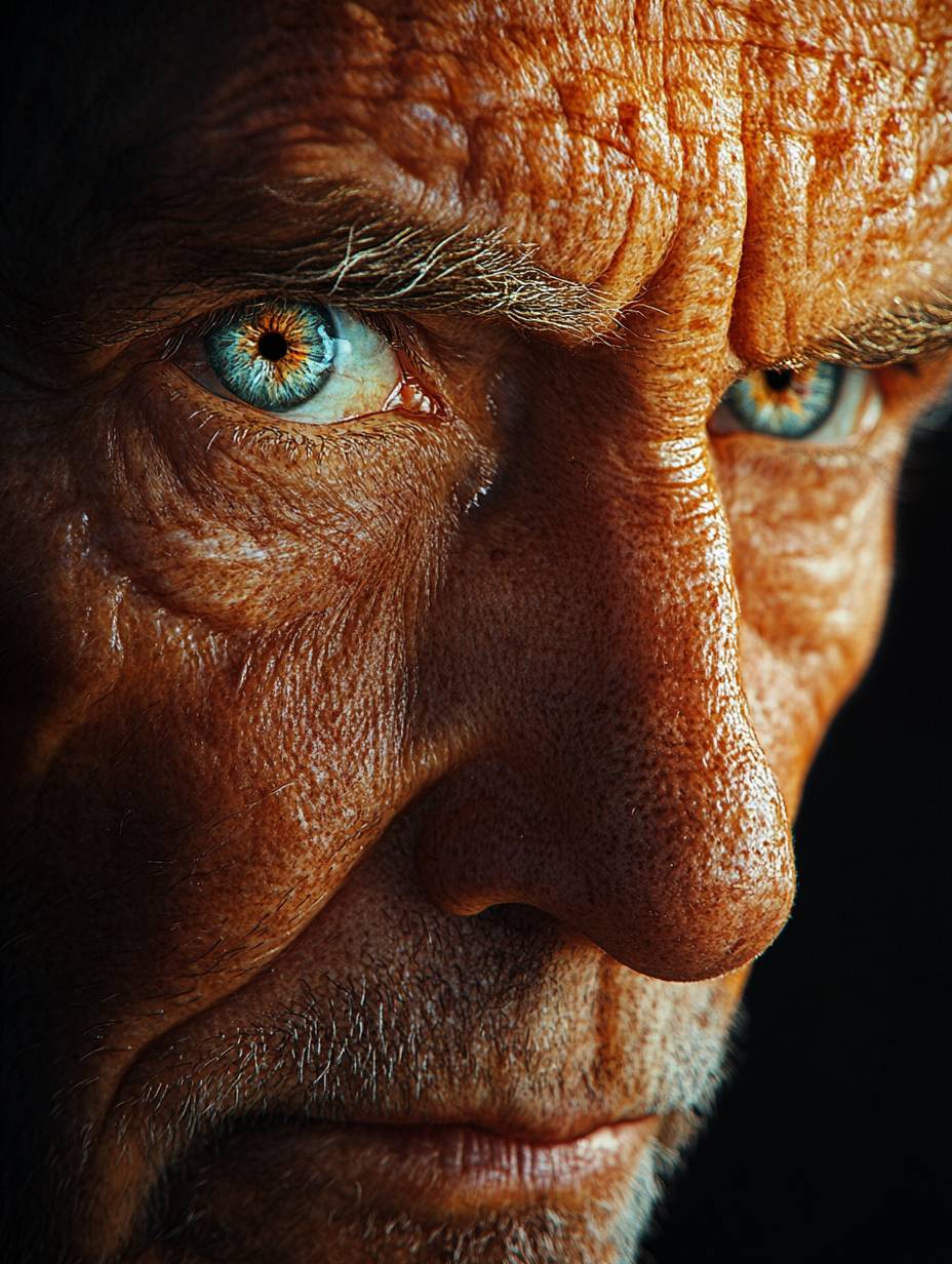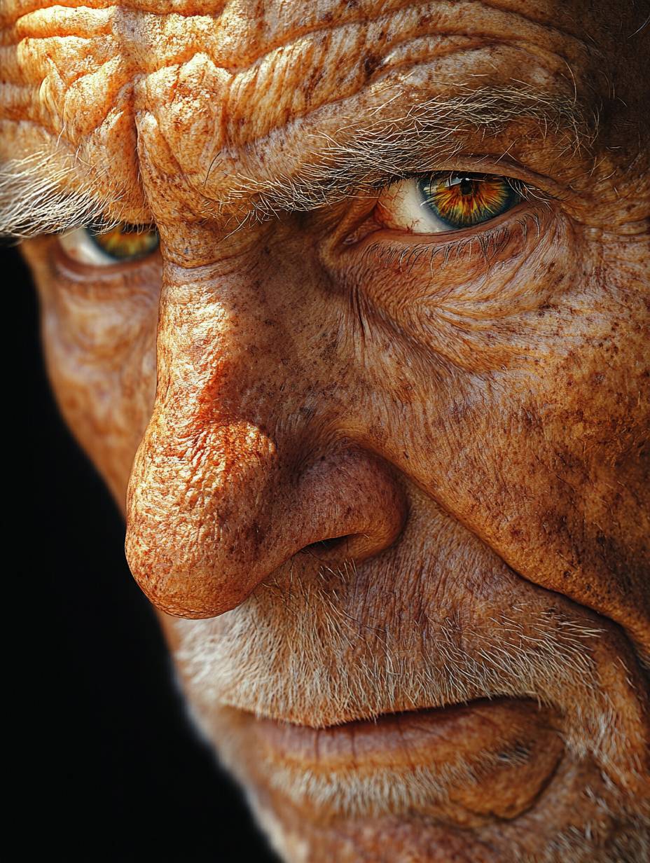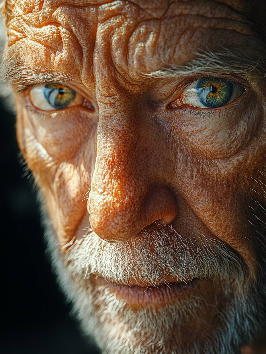 Photorealistic close-up of an old man's wrinkled face, deep lines etched with age, under bright sunlight. The sun casts soft shadows, highlighting every crease and detail. His weathered skin tells a story of a life lived fully, with intense, clear eyes reflecting wisdom and experience, set against a warm, sunlit background --ar 3:4 --style raw --stylize 800 --v 6.1