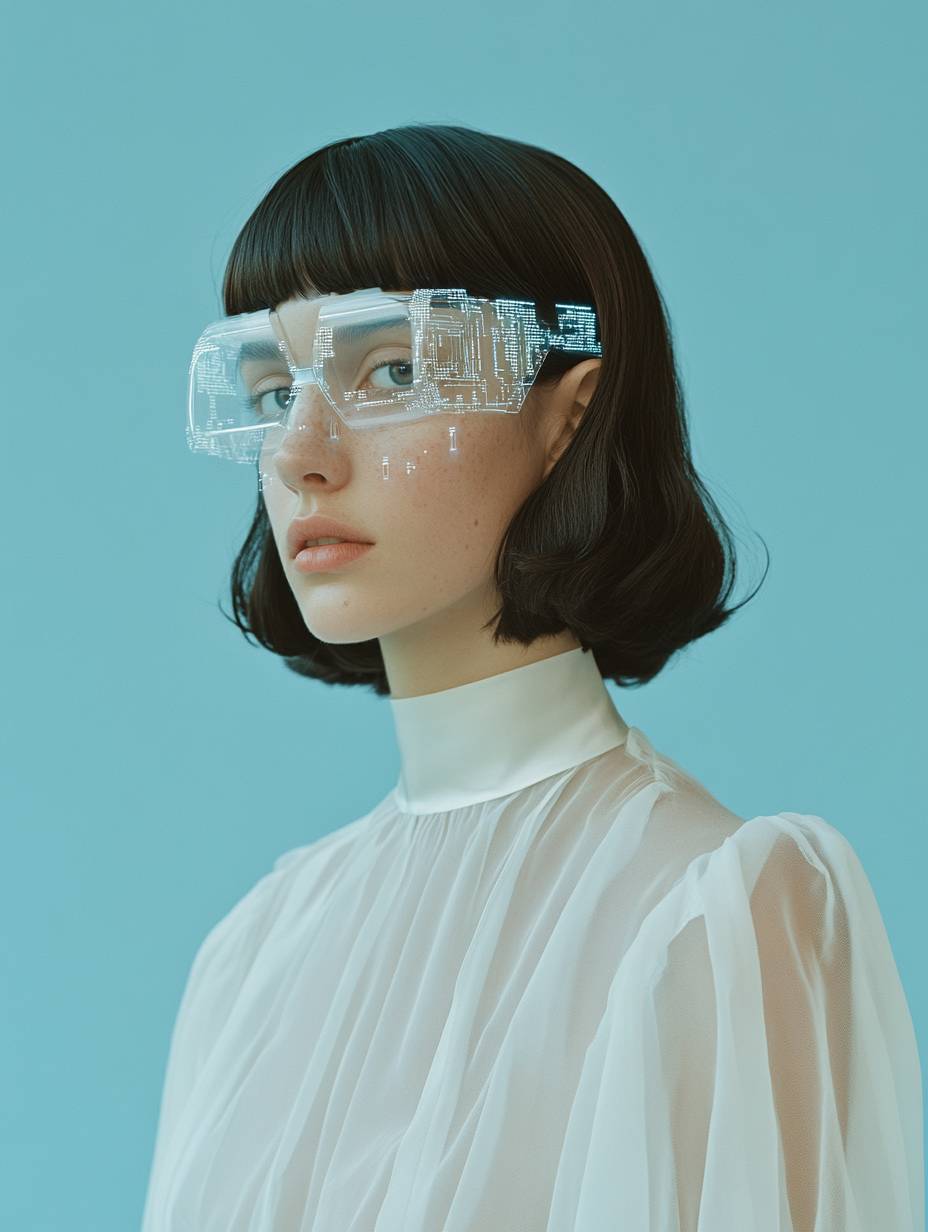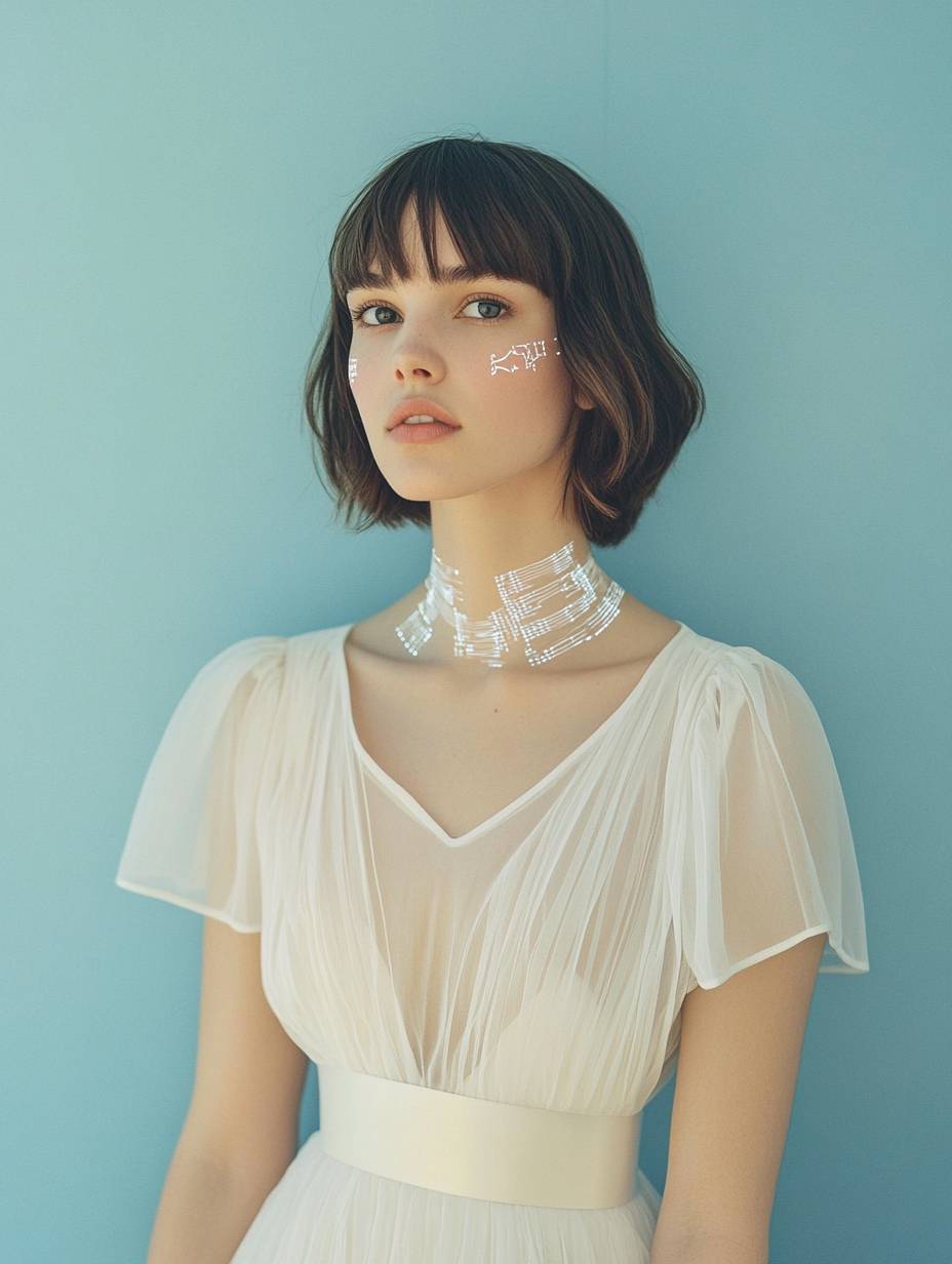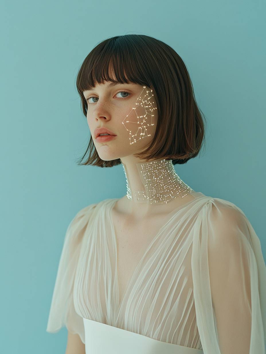 medium size shot, 3/4 profile looking at the camera, Hasselblad shot of a beautiful white woman with brunette bob hair in a sheer white satin minimalistic dress with a minimalistic satin belt at the waist, subtle cyborg features on face and neck with tiny, flat, thin, white, transparent electronic pieces inlaid on her skin, on a baby blue background, magazine style --ar 3:4 --v 6.1