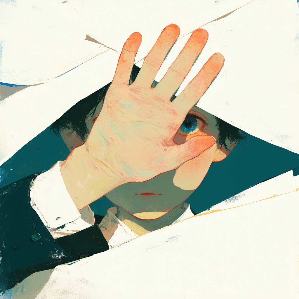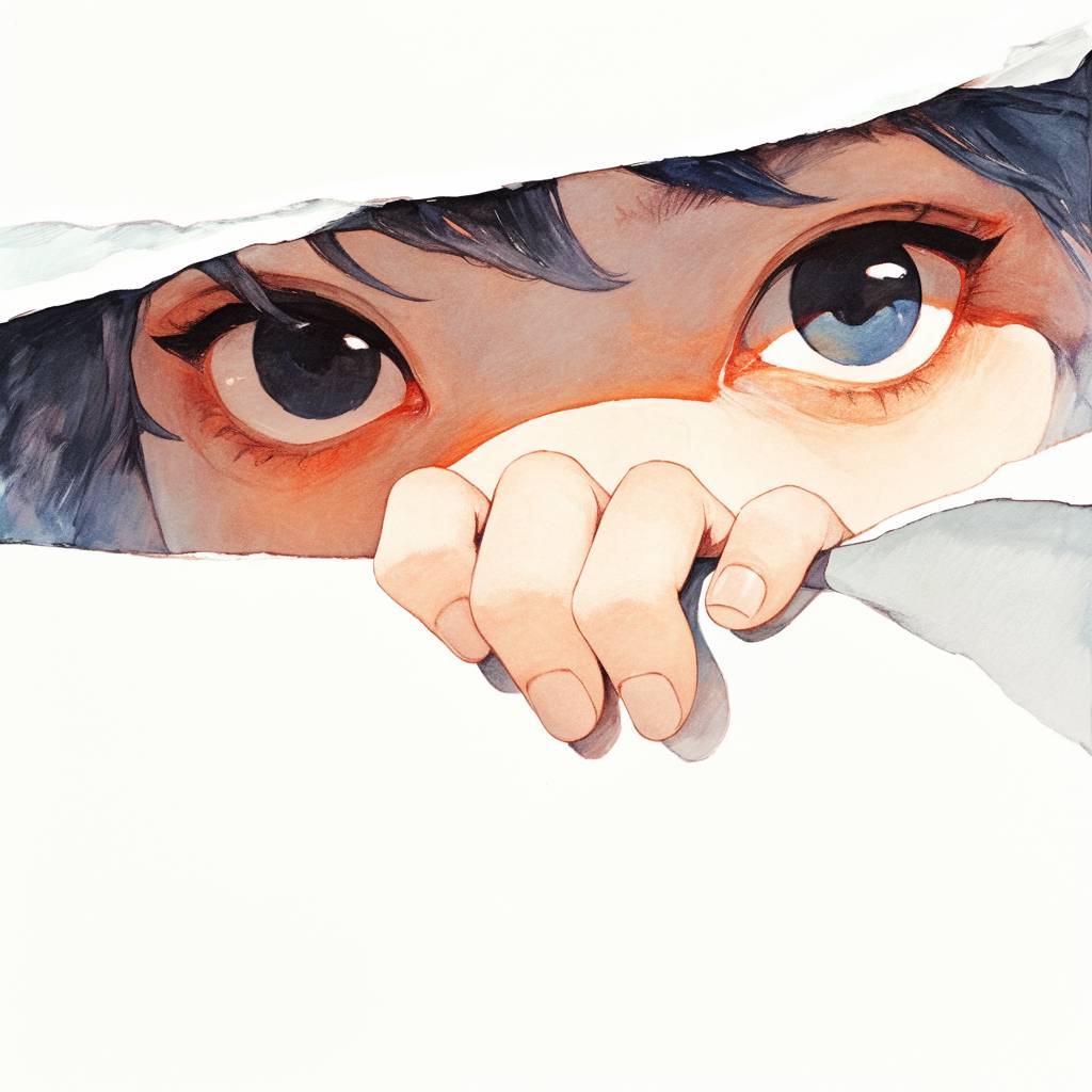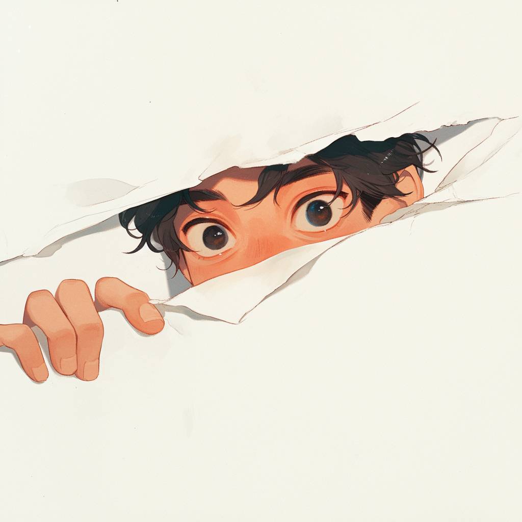A illustration of a boy's hand peeking out from a white hole in paper, with a white background. with his eyes peeking through the hole in front , delicate eyes features, create a mysterious atmosphere --ar 1:1 --stylize 180 --niji 6