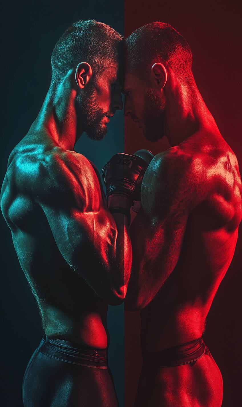 split view of fighter atheletes versus. Dramatic lighting, subdued colors --v 6.1 --ar 3:5