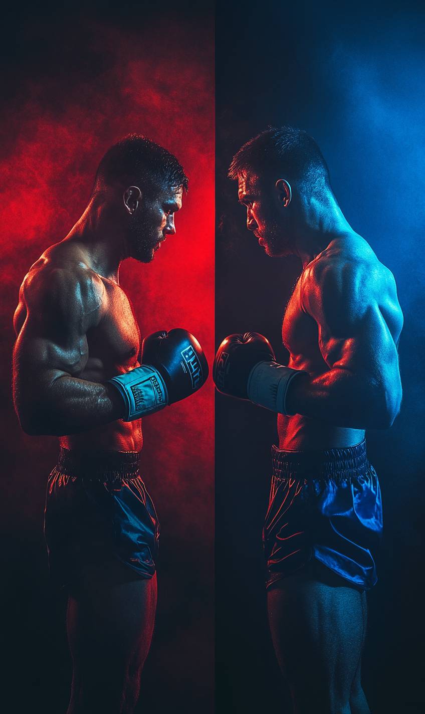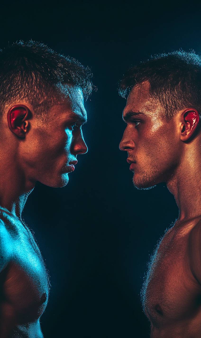 對比戰鬥運動員的分屏視圖,戲劇性照明,柔和色調