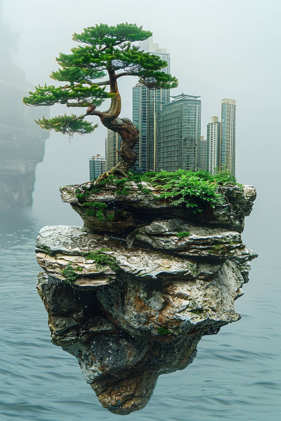一幅高度細緻的轉移攝影作品,描繪了一盆日本盆栽,盆栽中心是一塊由城市高樓組成的岩石,四周環繞著無盡的海水。
