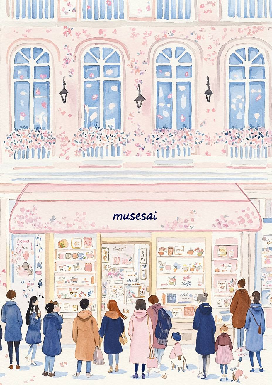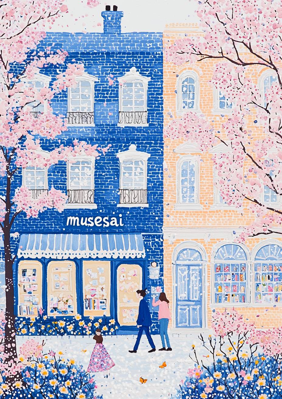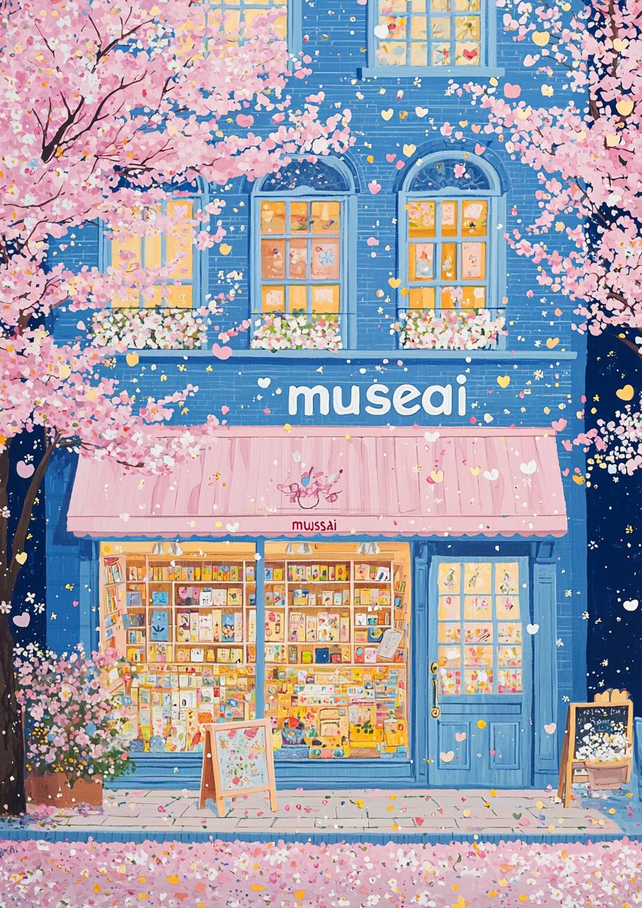 Autumn Festival, a bookstore with "musesai" on the front, from a painting by person, in the style of folk art-inspired illustrations, bold patterned quilts, pastel colours, bloomcore, mixes painting and ceramics, precise, detailed tensegrity architecture paintings, cute and dreamy, illustration by Olivia Gibbs, --ar 100:141 --quality 2 --style raw --personalize hq1xebf --stylize 1000 --v 6.1