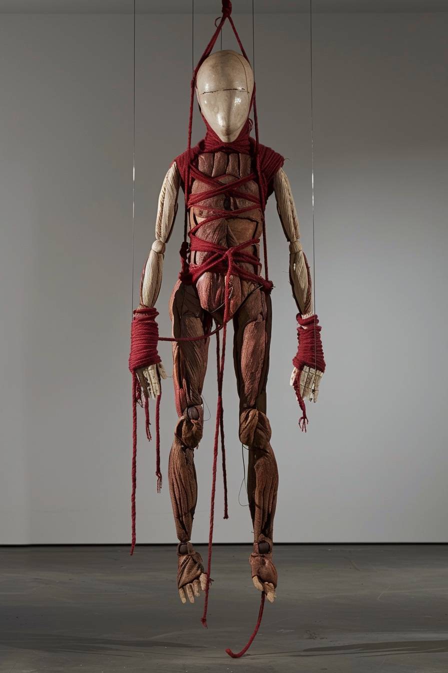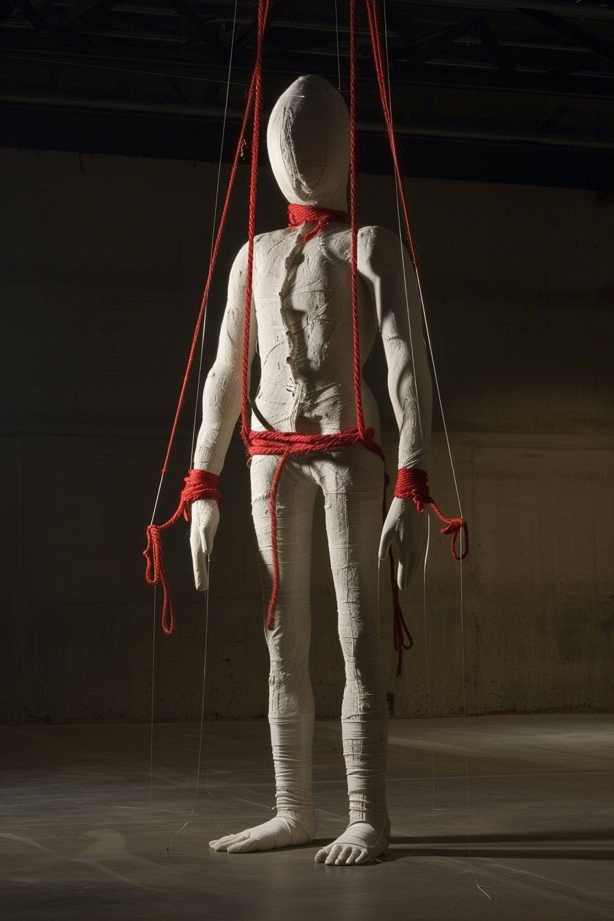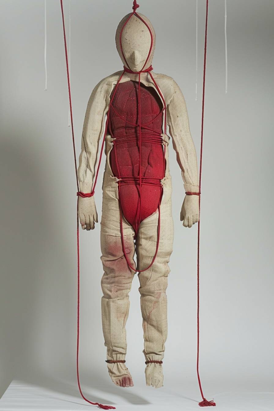 A surrealistic-style marionette, influenced by the artistic approaches of Rene Magritte, Patricia Piccinini, and Mark Dennis, and designed in a robust Brutalist style. This imposing figure stands approximately 1.8 meters tall, faceless, with red hemp ropes tied around its body, half arms and legs, and is suspended from a large frame by transparent thin tubes. Its exterior is starkly divided into red and white halves, presented in an upright stance facing the camera. Designed for tactile engagement, the surface is suitable for striking, while its interior is stuffed with cotton, providing a soft, deformable texture --ar 2:3 --v 6.0