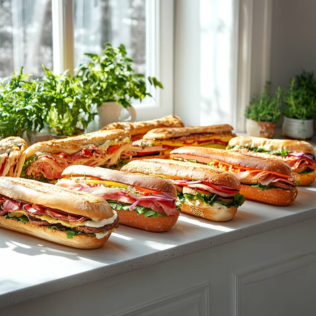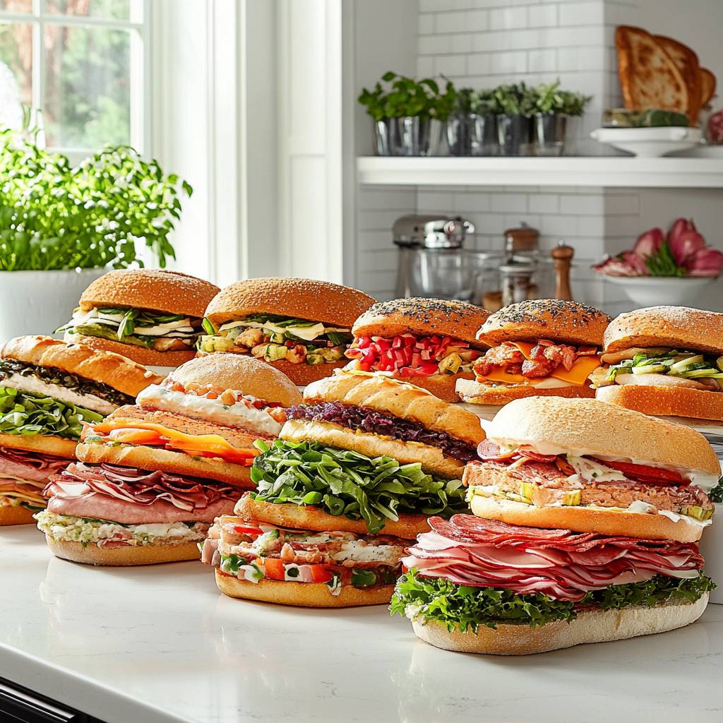Realistic photograph of a lot of differentes sandwiches in the kitchen's table. VERY colorful photo. Product photography on a white countertop to highlight the colors of the sanwcih. --v 6.1