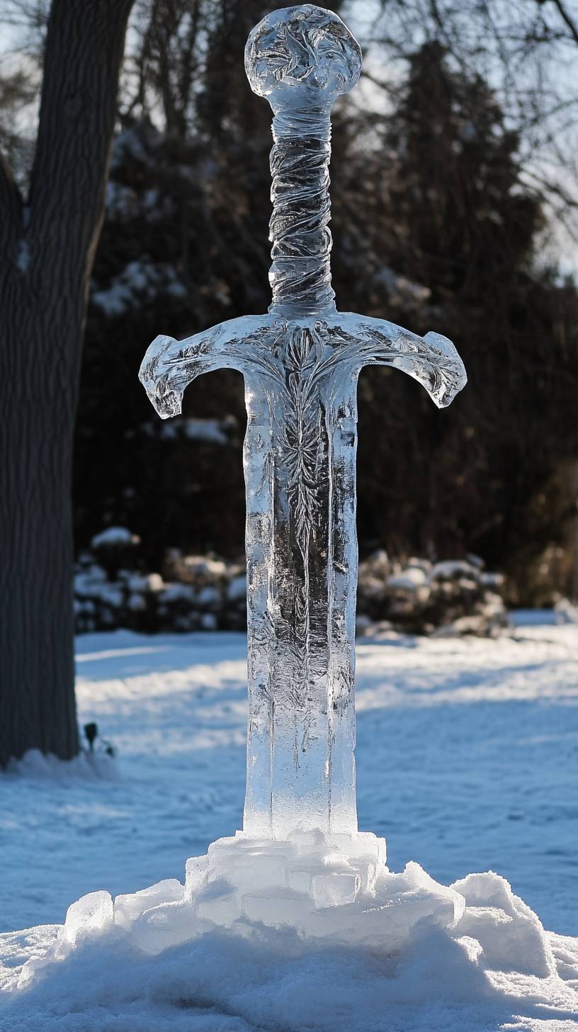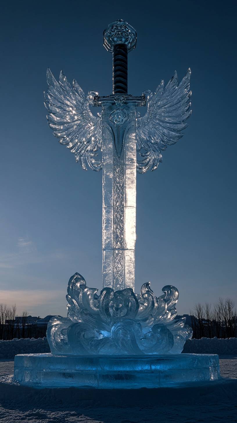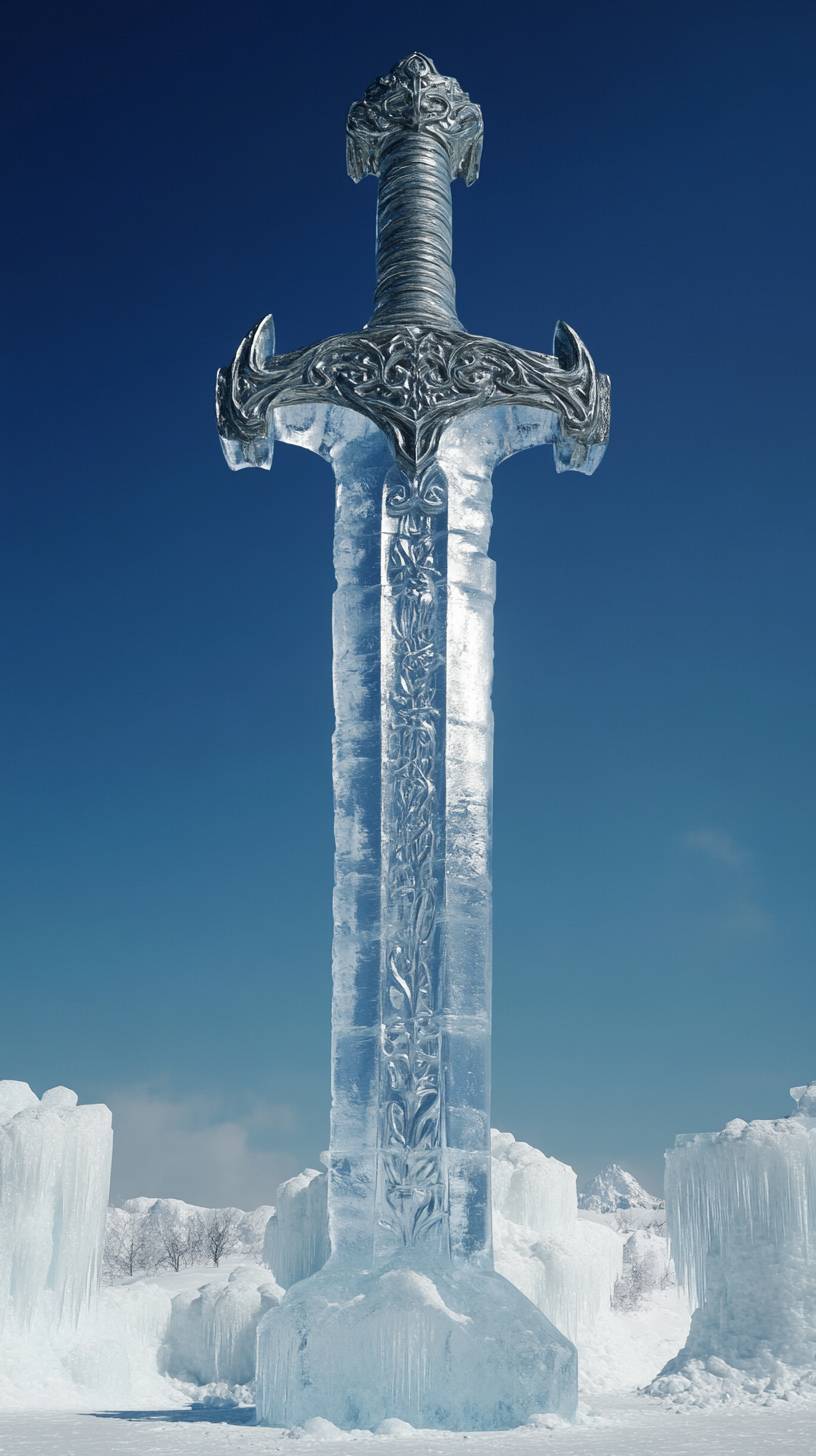 Knight's sword, Harbin Ice and Snow World, ice sculpture, front view, eye level Ice,Icy,3D rendering::2 ,UHD,::1 --ar 9:16 --style raw --v 6.1