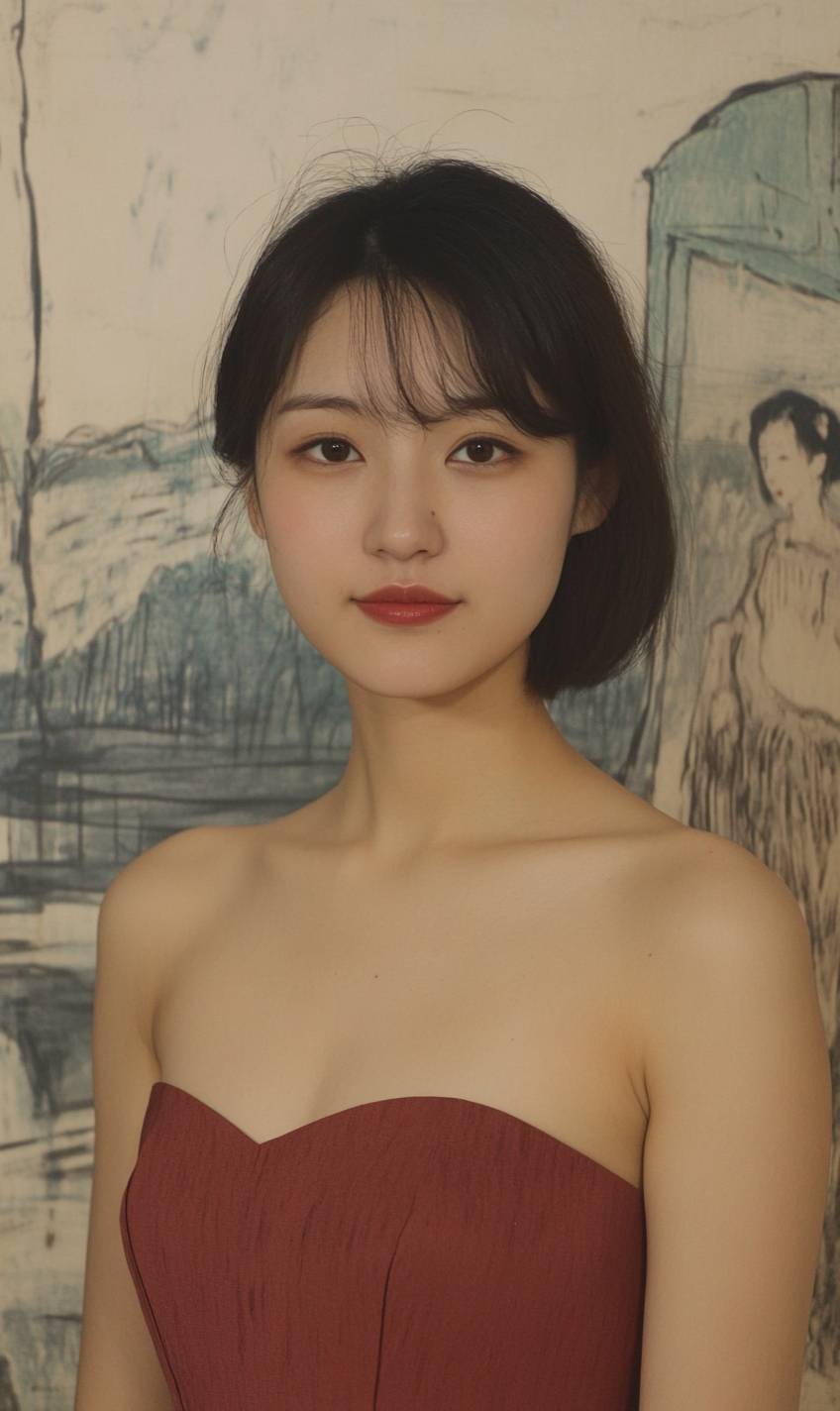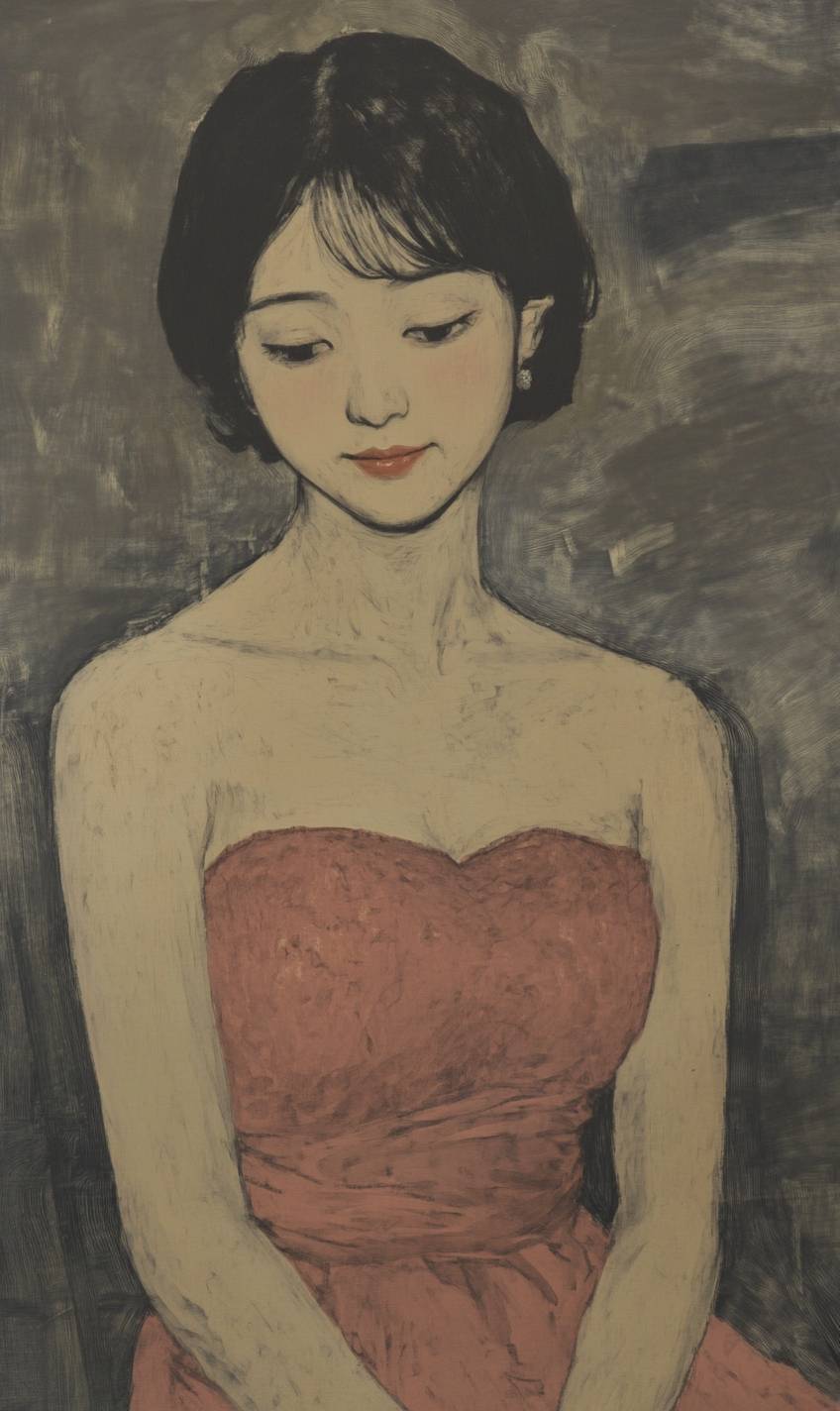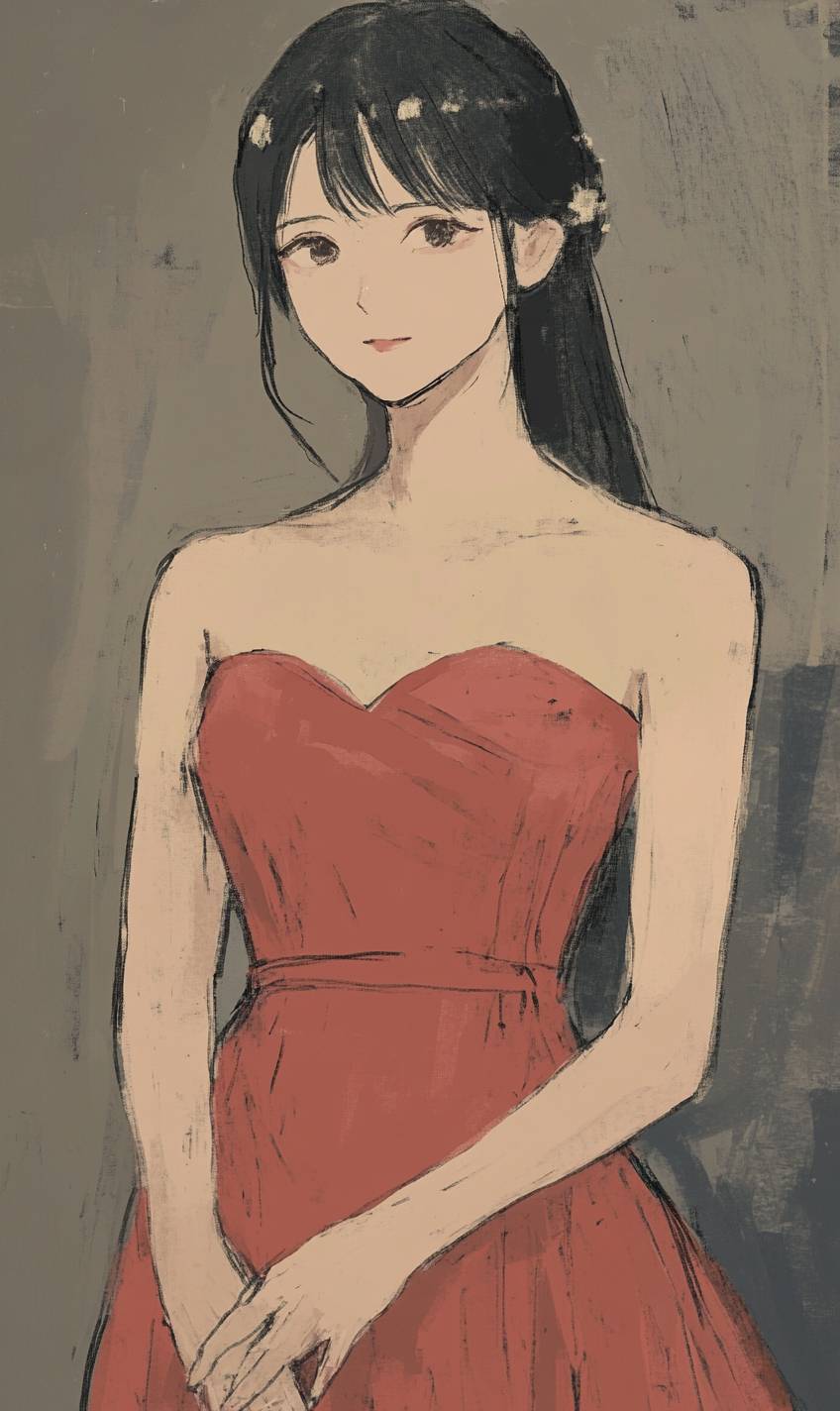 A 20-year-old Japanese girl wearing a red strapless dress. --sref 3470443040 --ar 3:5 --v 6.1