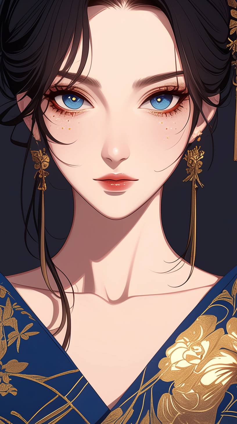 肖像,郭沫若,極簡構圖,正面,面部特寫,浪漫,別致,古典漢服,中國經典插圖,矢量圖像,明亮的眼睛,金色和藍色眼影,精緻的眼部細節,散發古老美的優雅,精緻的面孔,極簡墨跡,超細節,柔和的光線,美麗的陰影,8K,超高清