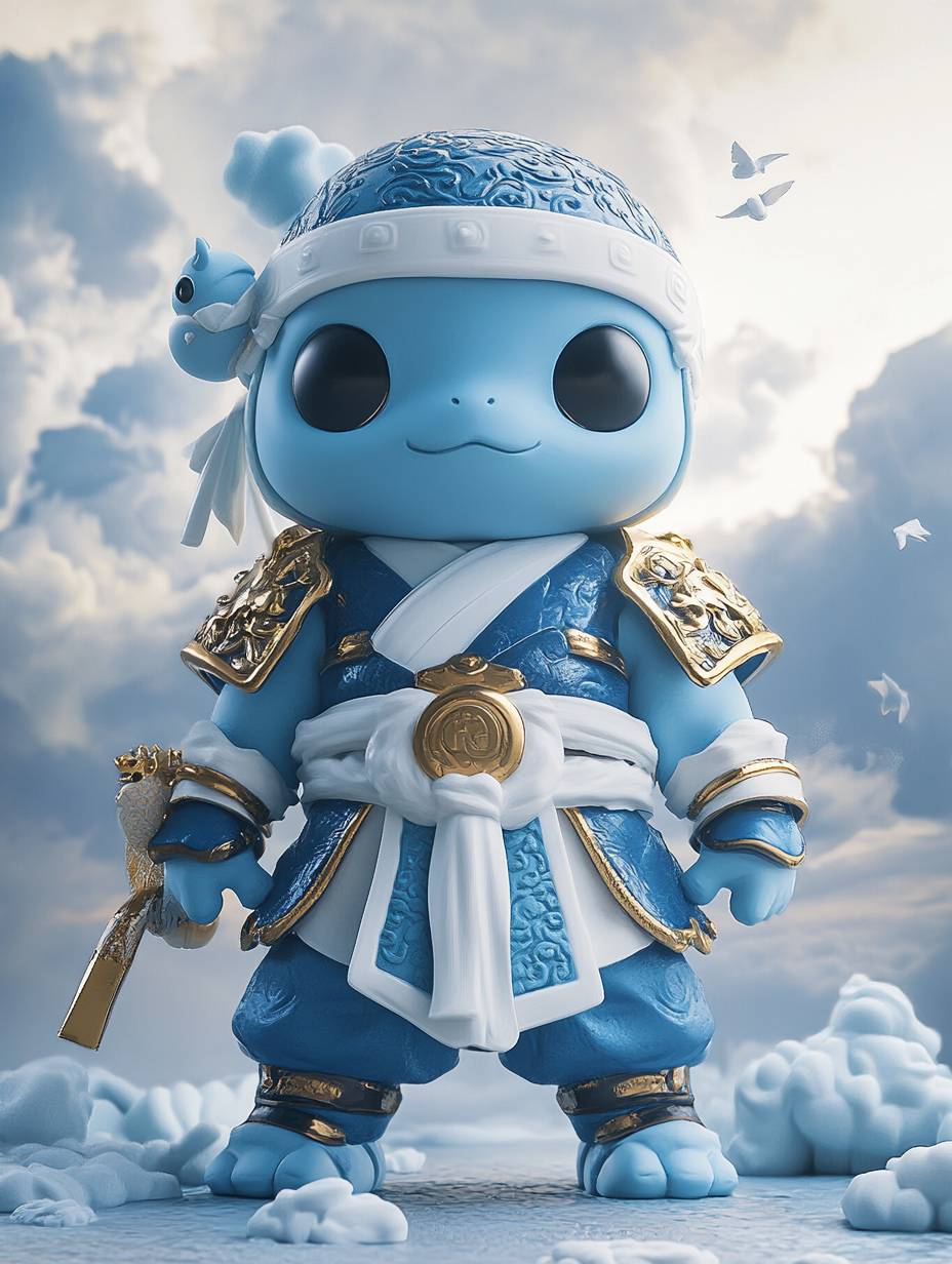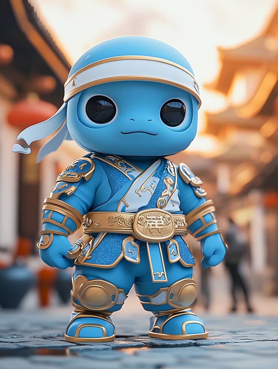 藍色漸變背景,東方風格的IP形象,龜人,龜臉,高身材,中國戰鬥服裝和精美武器,中國風格,衣服和武器主要以中國藍色為主,輔以金色和白色,全身,盲盒風格,泥土質感:2 Pop Mart,超可愛,可愛卡通風,Kawaii,粉彩色,未來感,Chibi,角色設計,Octane 渲染8K,高清,3D,C4D,Popmart的3D渲染。