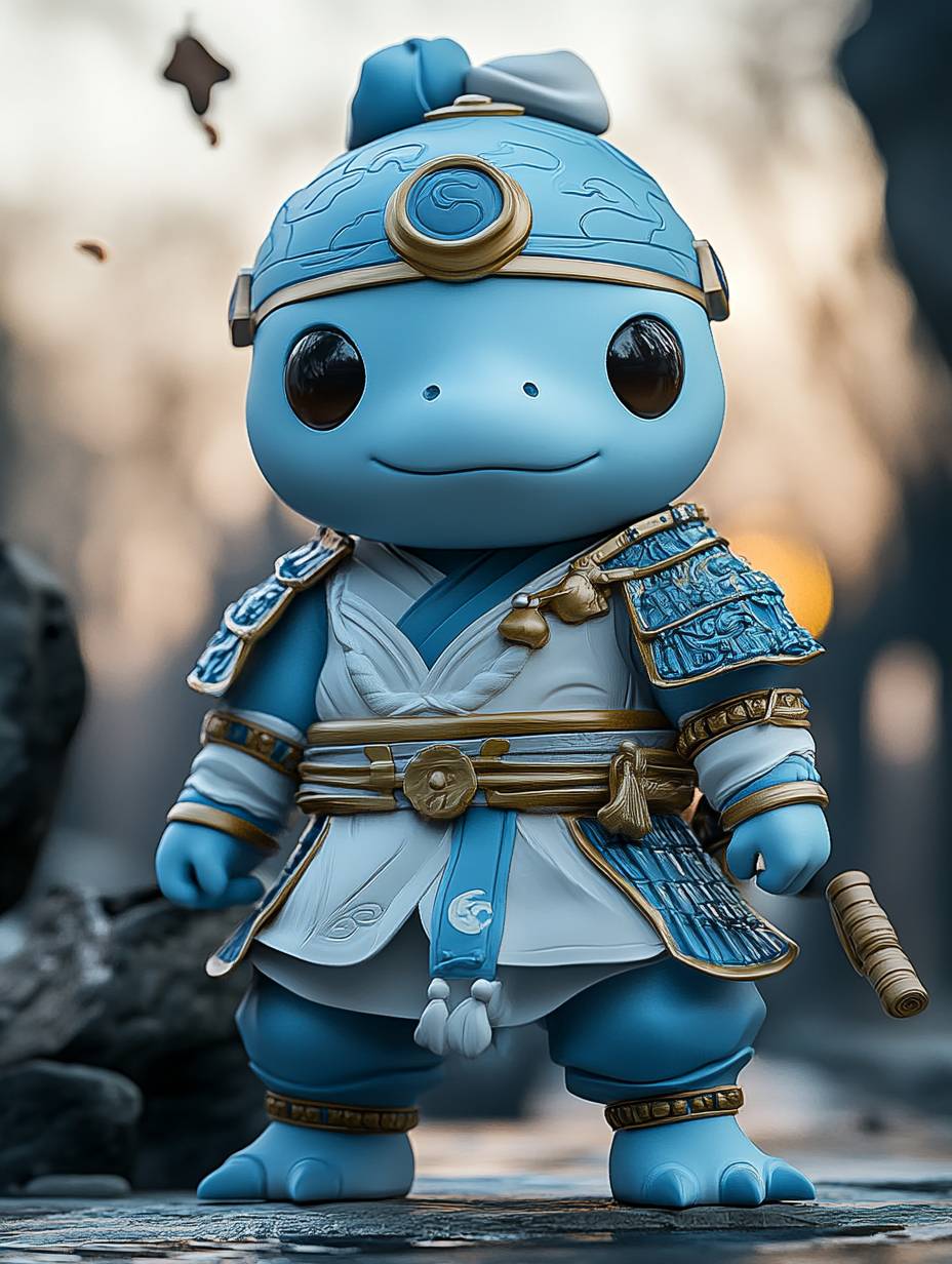 Blue gradient background,An Eastern style IP image, turtle man, turtle face, tall body, Chinese combat clothing and exquisite weapons,Chinese style, The clothing and weapons are mainly in Chinese blue, supplemented by gold and white, whole body,Blind box style, Clay texture: 2 Pop Mart, super Cute, Cute cartoon+, Kawaii,pastel colors,sense of the future, Chibi,character design, octane render 8k, HD,3d,c4d, 3D rendering of Popmart --ar 3:4 --style raw --stylize 250 --v 6.1