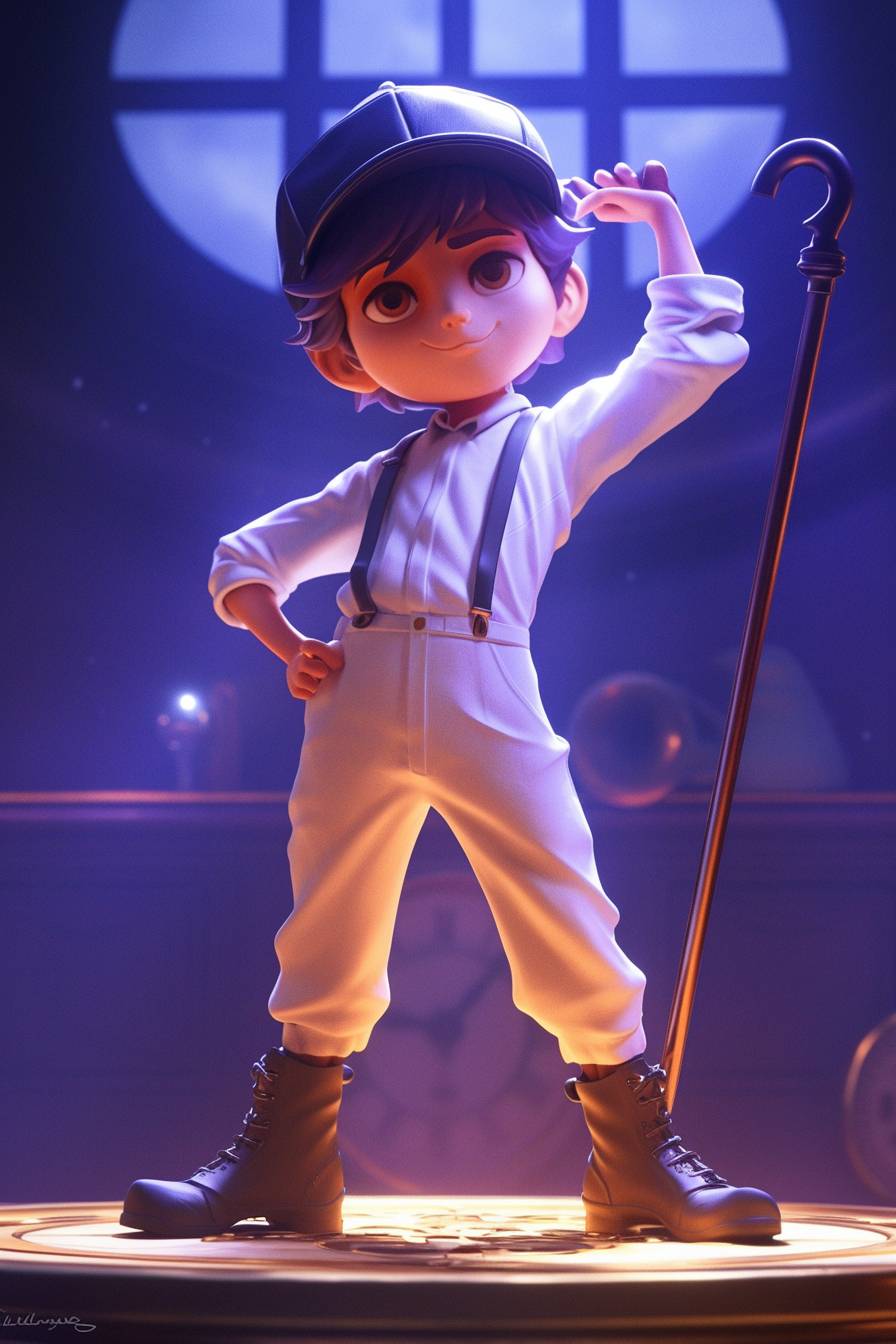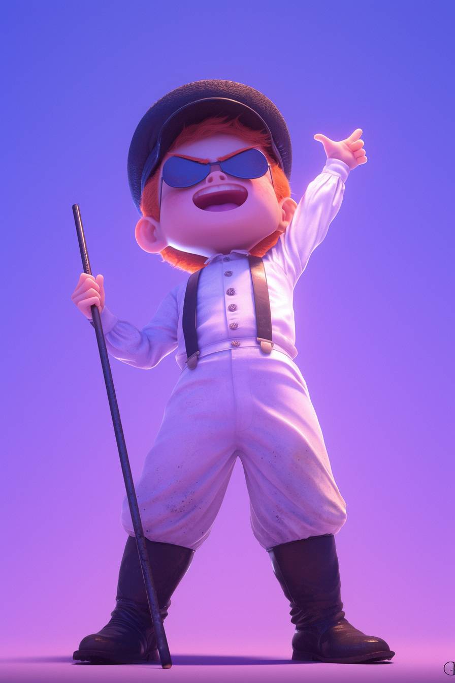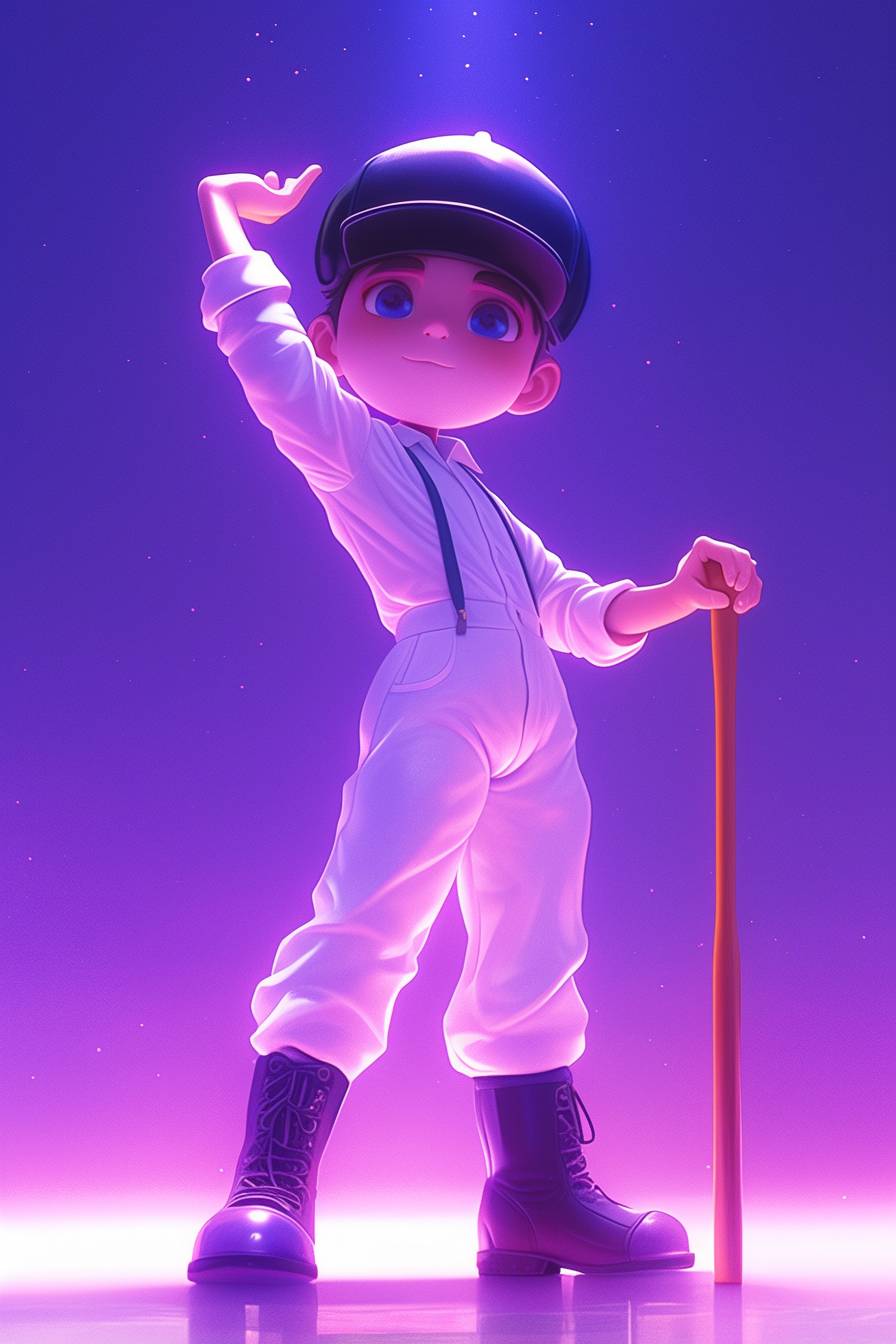中景,一個動畫場景,展現了來自《發條橙》的八歲小惡棍亞歷克斯·德拉杰,穿著外面有白色板球護裆的白色連體衣,搭配白色吊帶和工人靴,頭戴黑色圓頂禮帽,手中舉著白色手杖,身處一個可愛且卡哇伊的塑料環境的英國郊區,紫色燈光,鮮豔的色彩,充滿趣味的奇幻氣氛,以卡通藝術風格呈現。