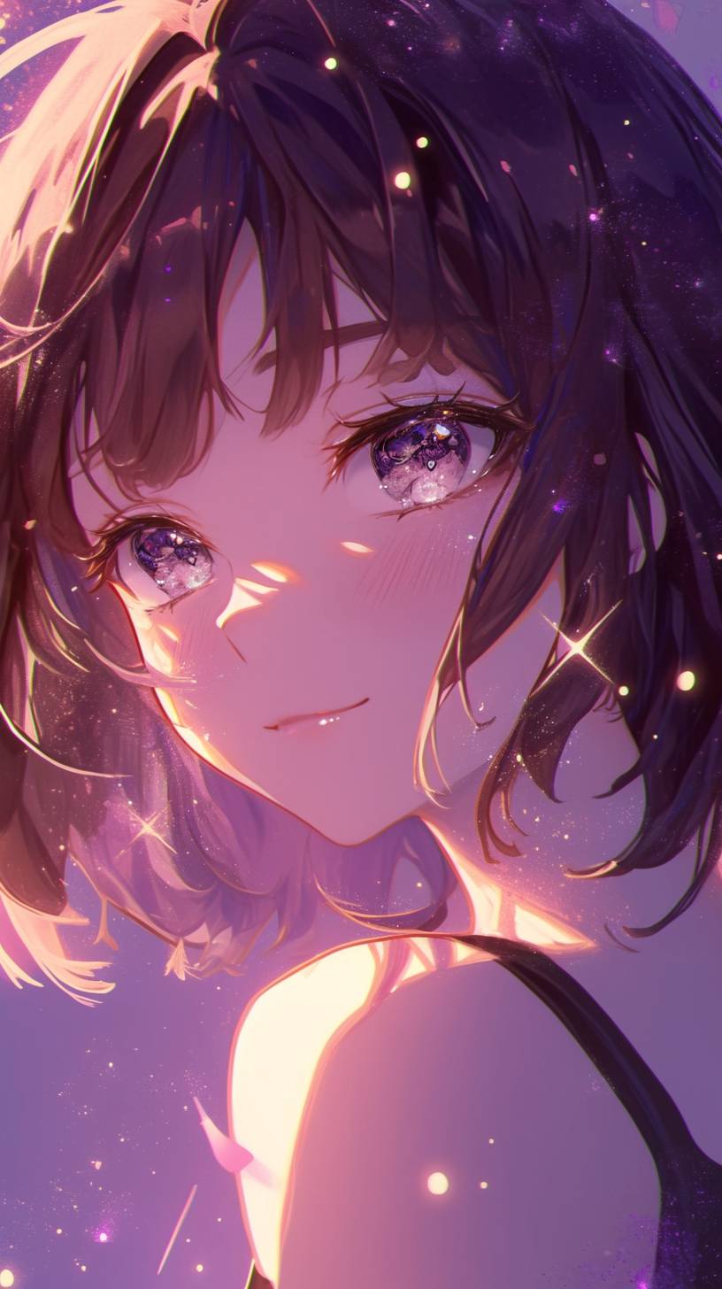 一個可愛的女孩,微笑,插圖採用水彩風格,風格類似於Atey Ghailan,背景採用柔和的粉色調和閃爍的星星。