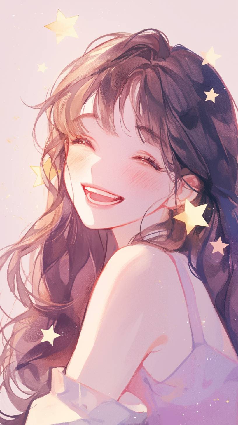 a cute girl , smilling, the illustration is in a watercolor style, in the style of Atey Ghailan, The background features soft pink tones and twinkling stars. --ar 9:16 --niji 6