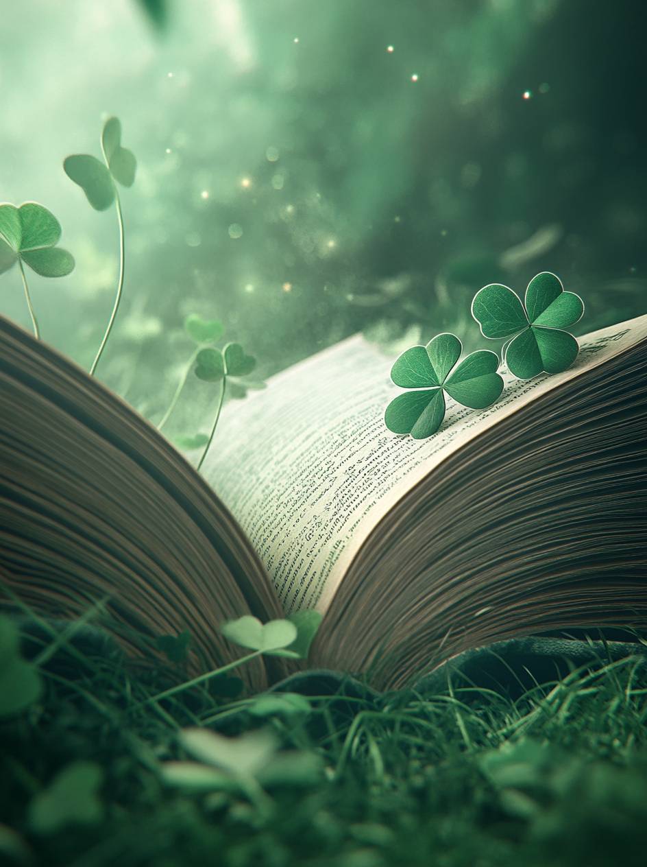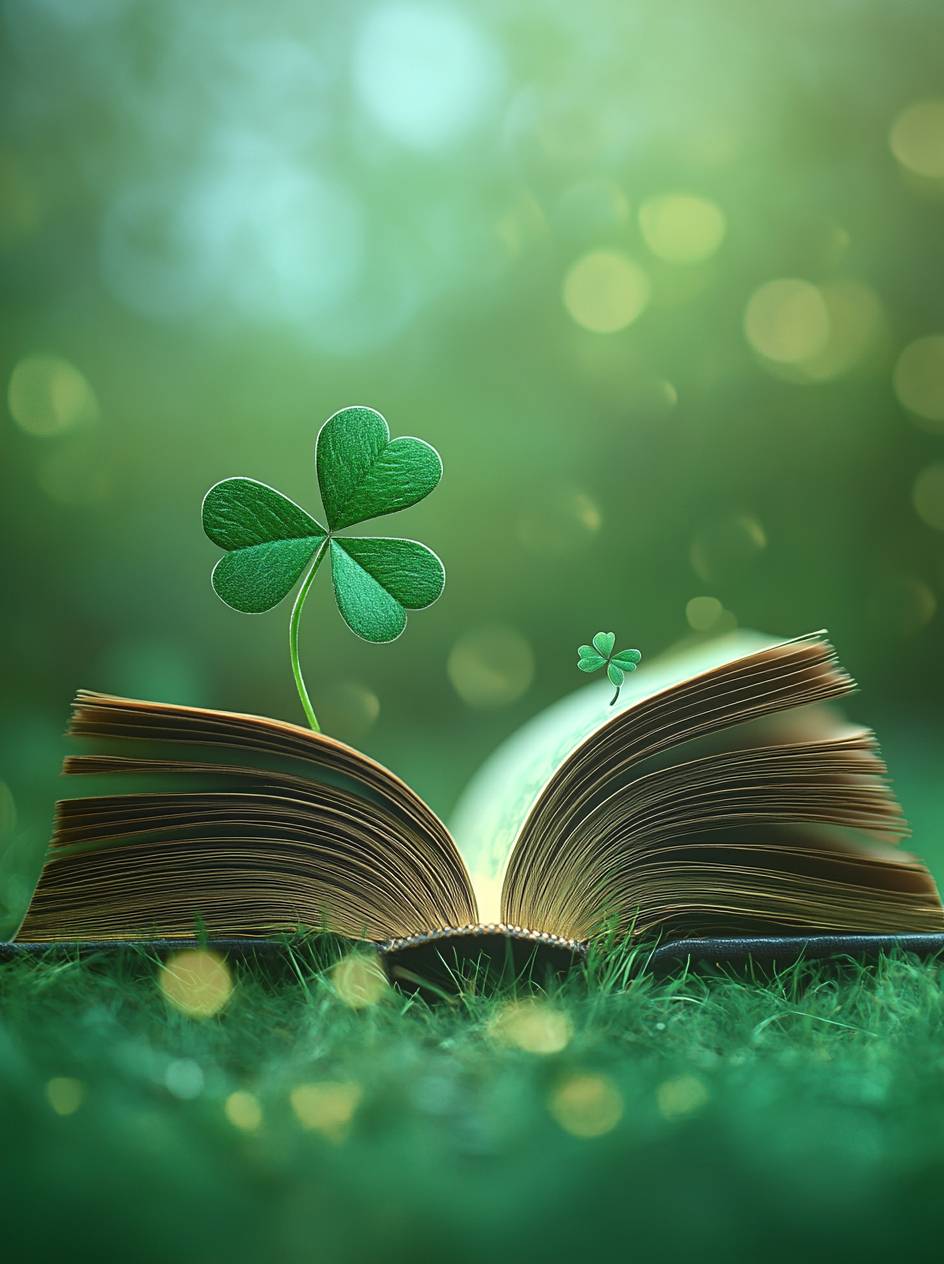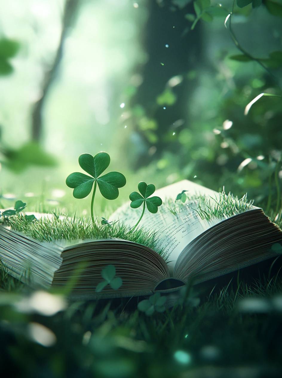 一本翻開的書,頁面看起來像草,書角裝飾著四葉草。背景模糊且綠色,營造出戶外的感覺。一片小的三葉草坐落在其中一頁上。