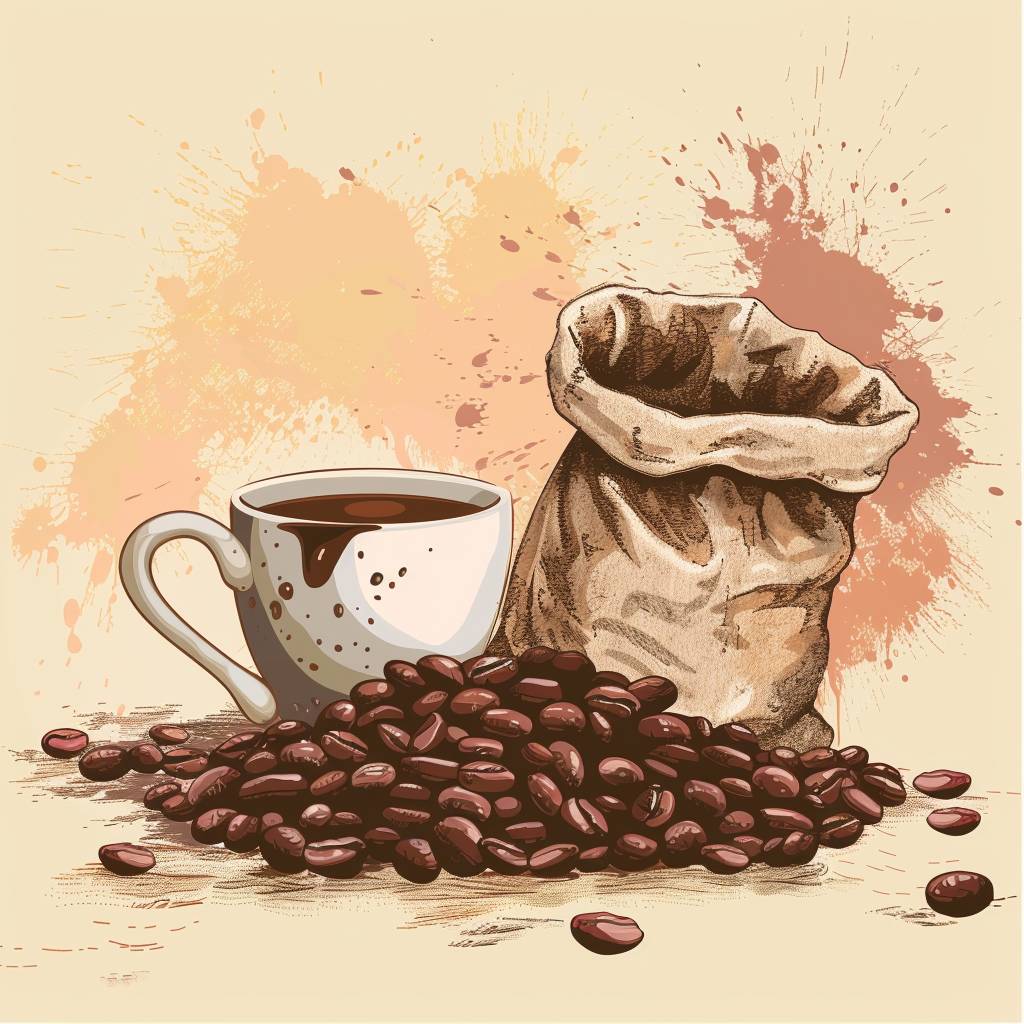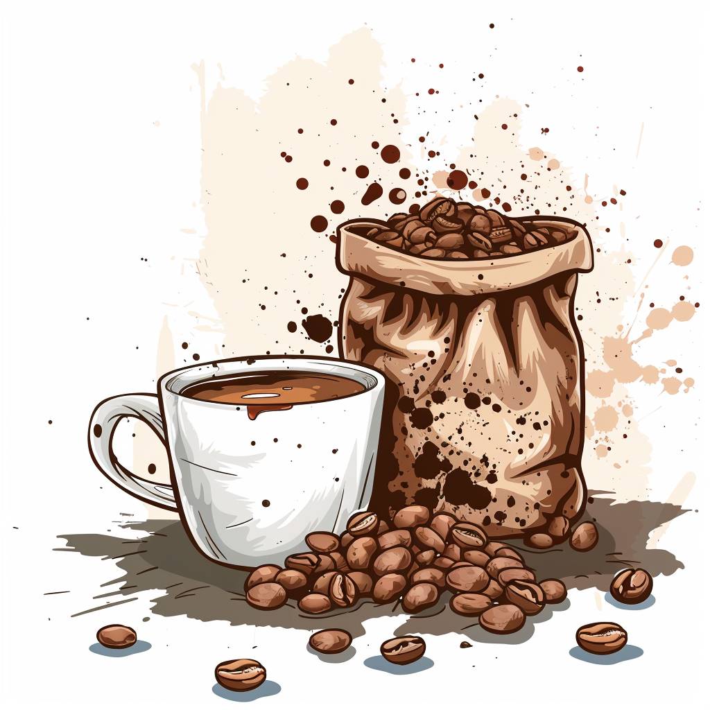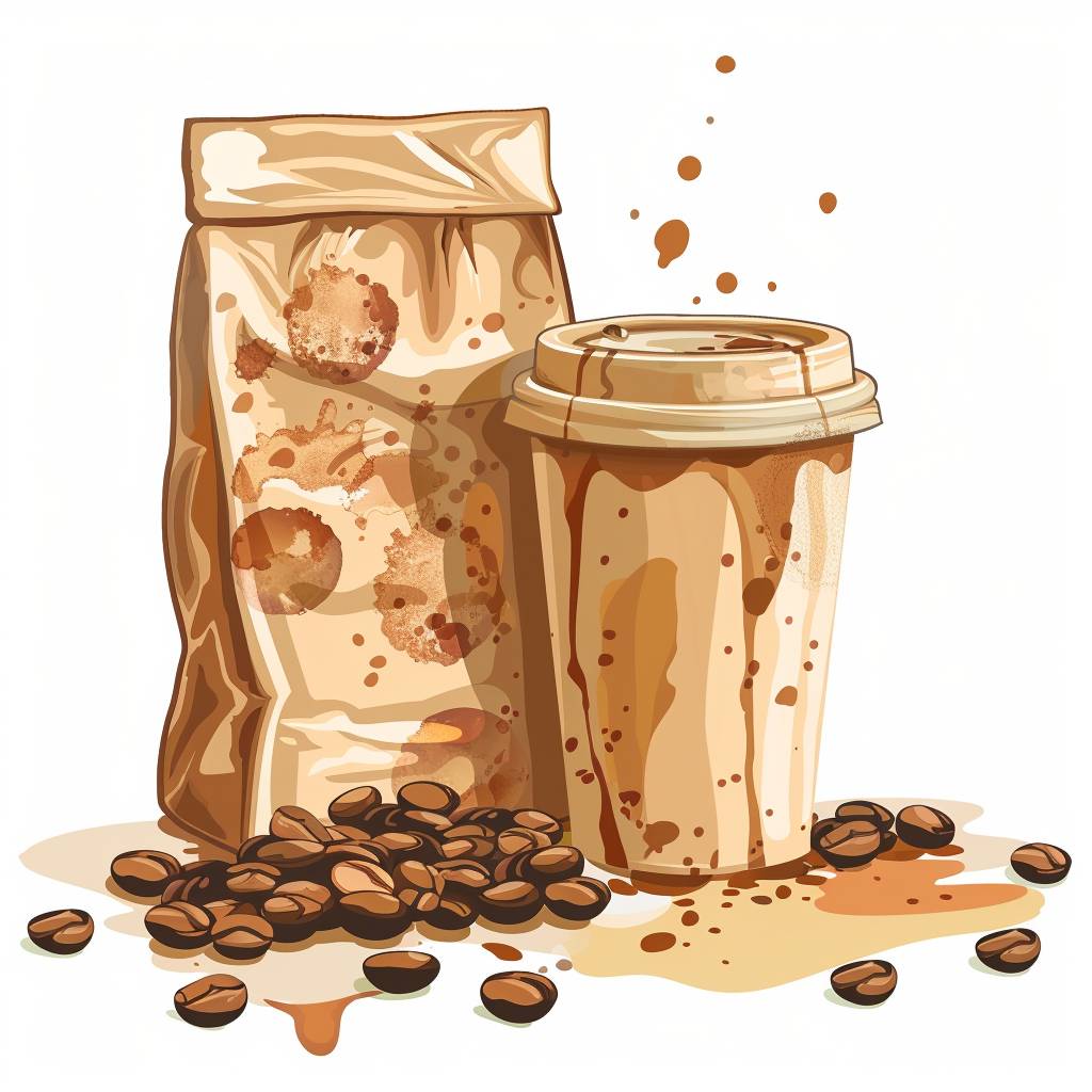 Advertisement for bags of coffee beans and a cup with coffee stains on it, vector icon, isolate, template, copy space, (colors) --v 6.0