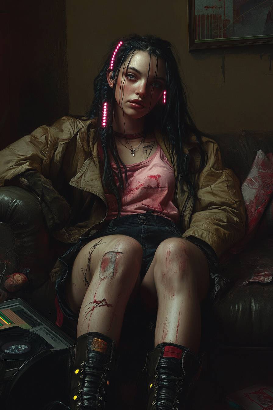 Cyberpunk, a drawing of a gritty female model with LED braids is wearing tshirt and a trench coat with vinyl boots, reclining on a couch, set in a modular apartment interior with a vintage vinyl player and scattered records, create a messy yet cozy atmosphere, dim lighting with bright neon strips outlining the walls --c 10 --ar 2:3 --style raw --sref 1091950851::1 2132028756::2 --sw 80 --s 200 --v 6.1