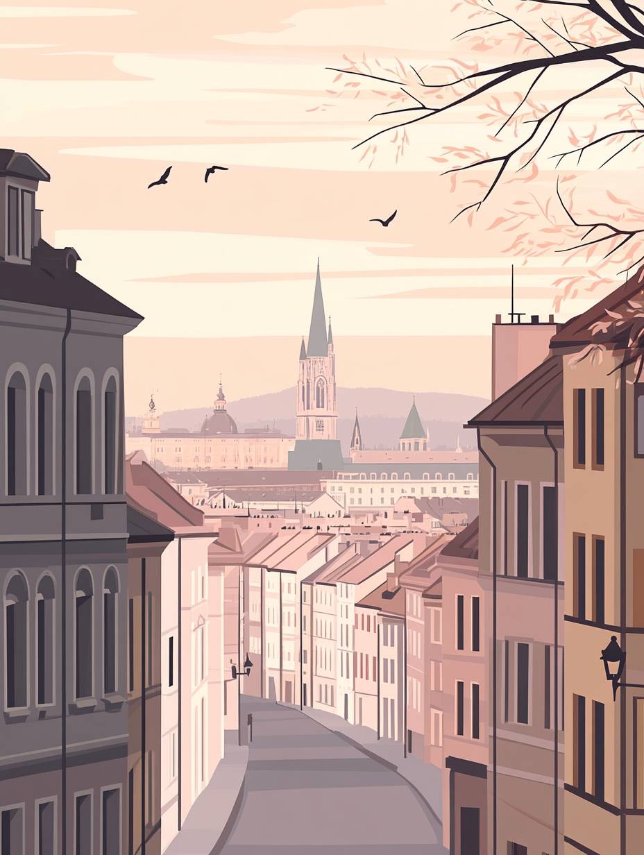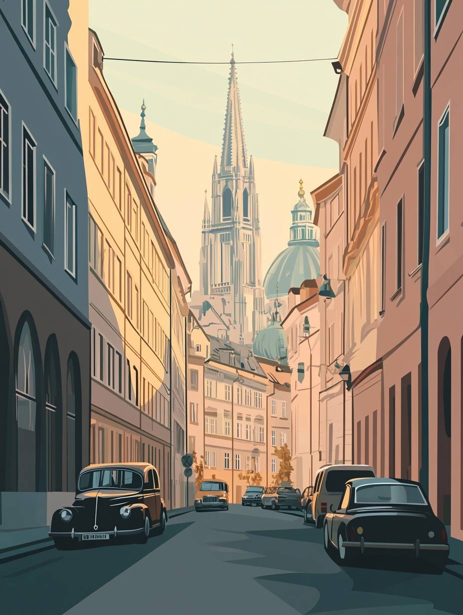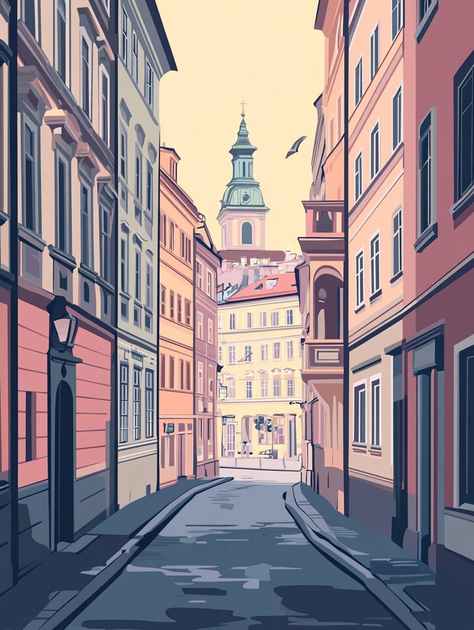 no text, minimalist travel poster featuring vienna, vintage retro flat vektor illustration, clean and simple design, soft atmospheric perspective, calm pastel colors, HD, 4k --ar 3:4 --v 6.1