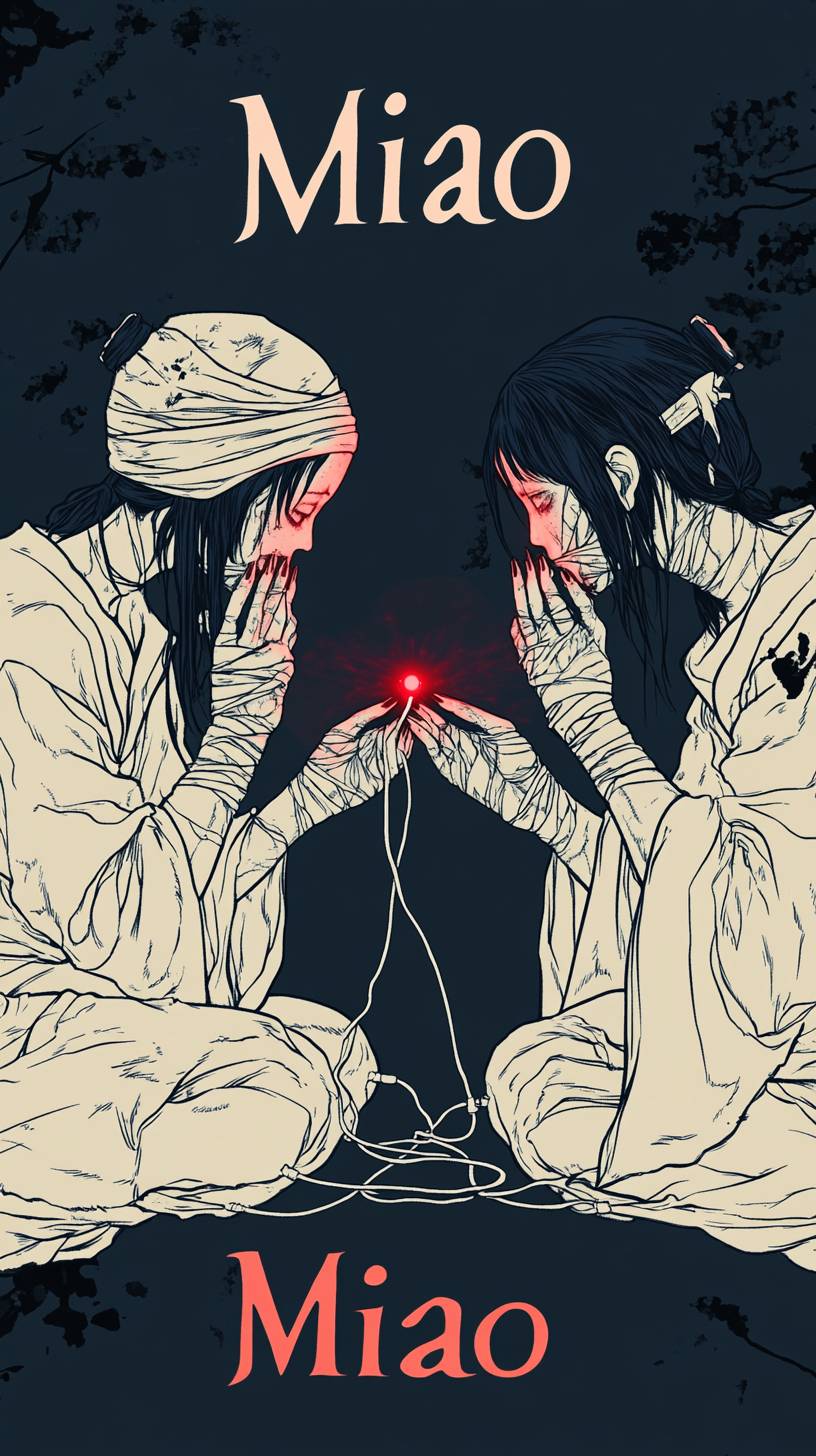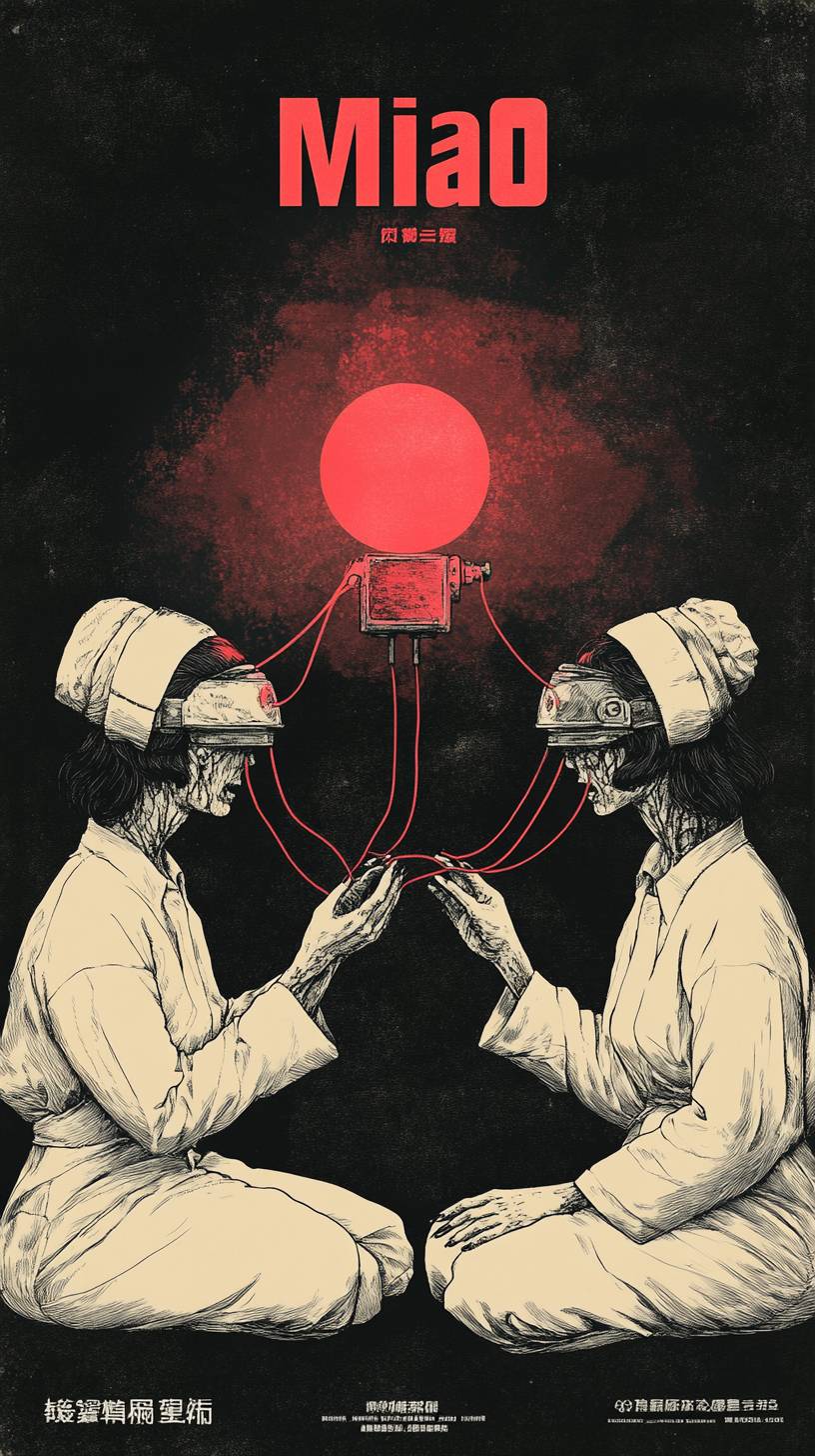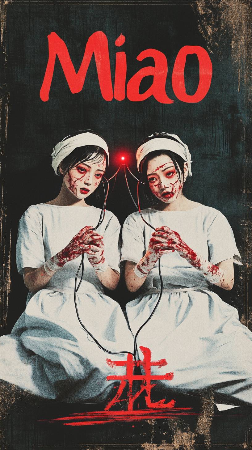 2d A poster for the Japanese horror film "Miao" from the eighties, two female hands with long nails and bandages in white hospital gowns on their knees performing an exorcism by connected wires to each other's heads. In one of them is a red light that illuminates her face. The background has black ink in retro style. The movie title says it all over the top in big letters. It should be scary and dark. --chaos 15 --ar 9:16 --style raw --v 6.1