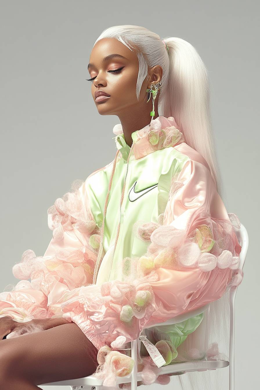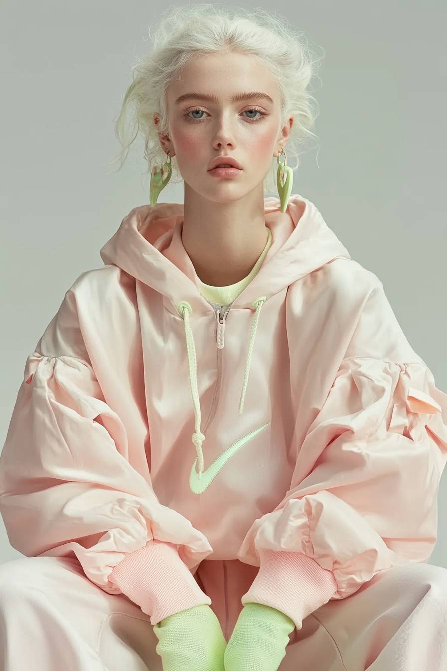 時尚編輯,Nike風格手冊,一位白髮靚模特的照片,穿著Nike運動服,時尚姿勢,背景為灰色,模特上有人工照明,戲劇性的高對比度陰影,粉色與霓虹綠的點綴,營造酷炫時尚的氛圍