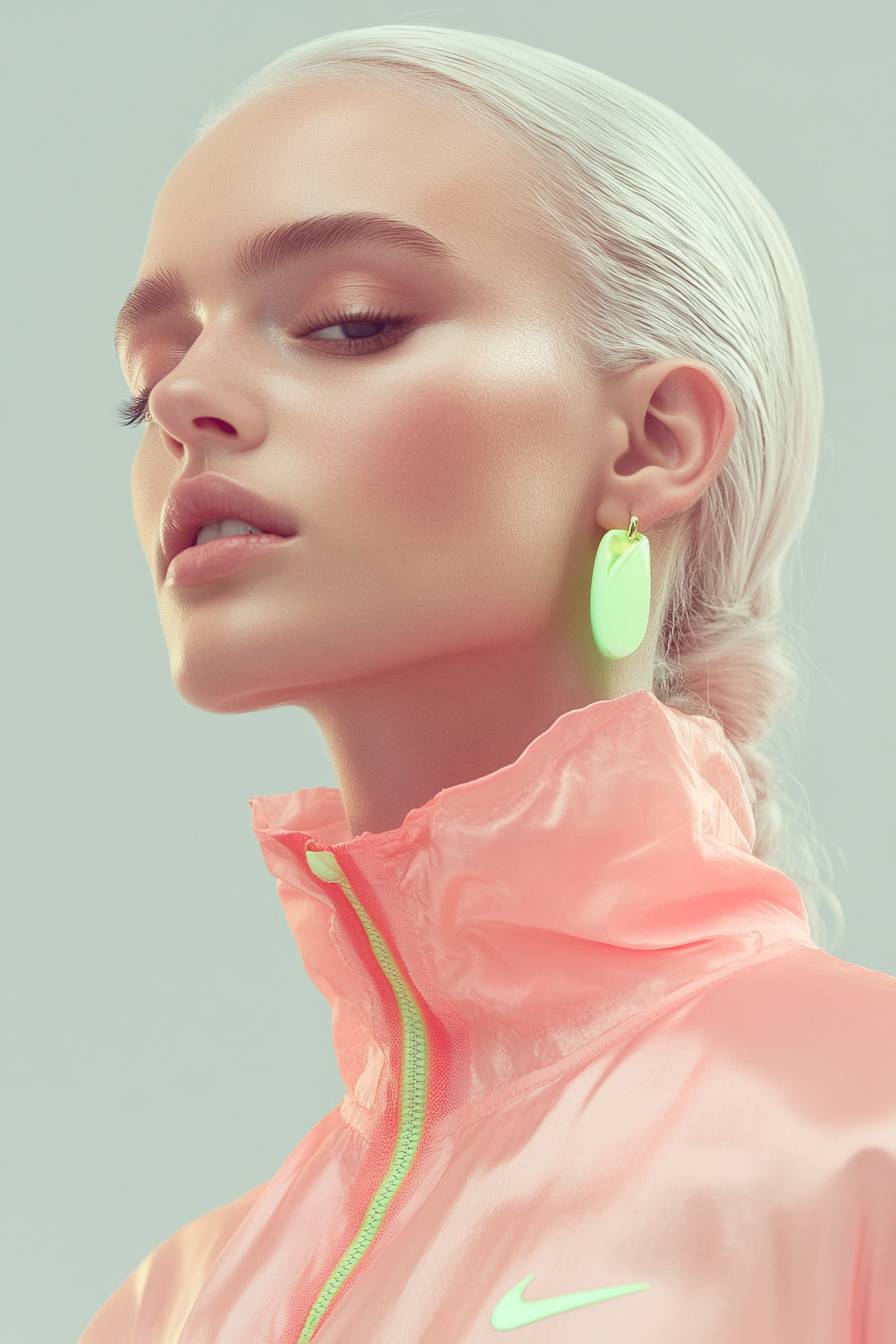 fashion editorial, Nike style book, a photo of stunning cool model with white hair, wearing an Nike sports wear, fashion poses, set a gray background, artificial light on the model, dramatic shadow with high contrast, pink with neon green accent, create a cool and fashion atmosphere --chaos 10 --ar 2:3 --style raw --sref 3348482396 --sw 100 --p rilpjdn --s 400 --v 6.1