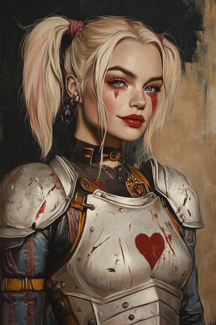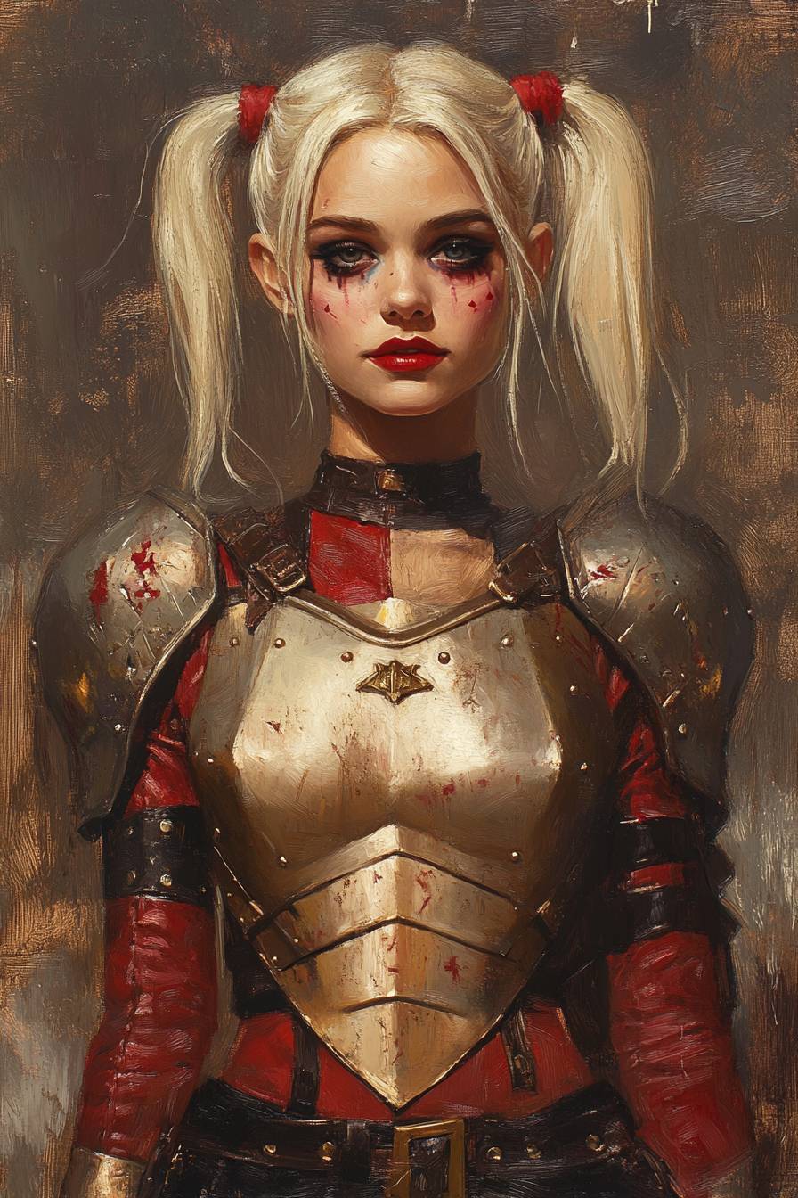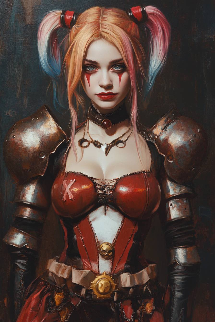 Renaissance-style portrait of Harley Quinn, detailed armor similar to that of a 15th-century knight, chiaroscuro lighting, oil on canvas, in the style of Leonardo da Vinci --ar 2:3 --v 6.1