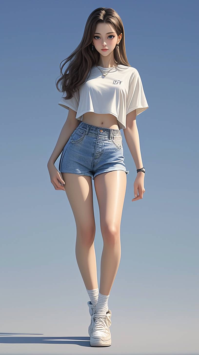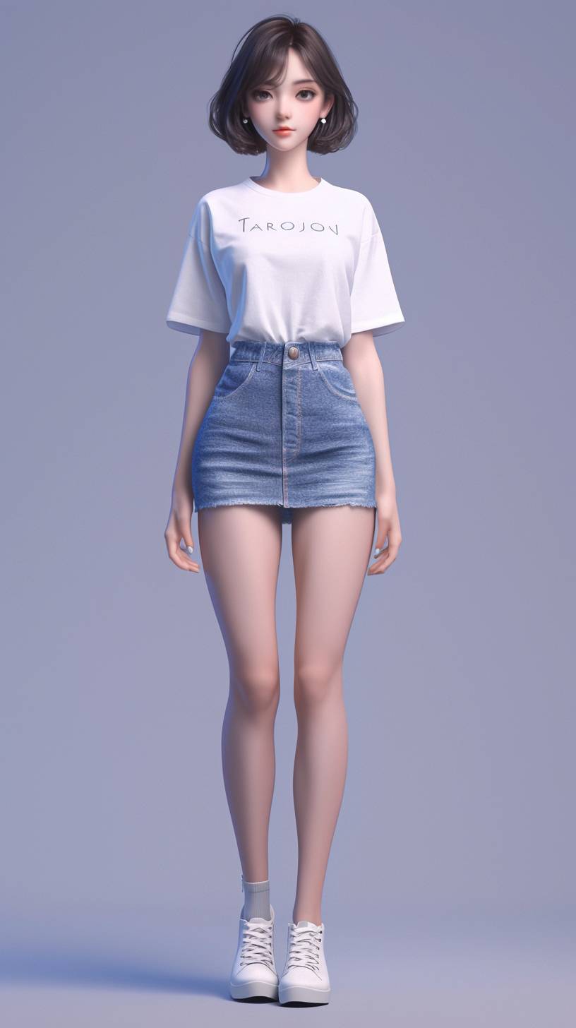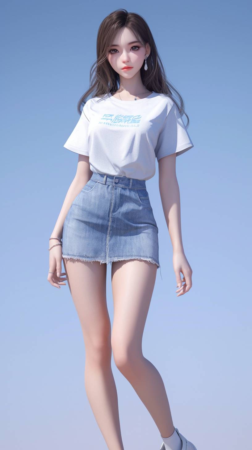時尚服裝設計,中國美女模特穿著T恤和牛仔裙,時尚新穎的服裝設計,穿著白色鞋子,時尚模特身材,全身,青春靚麗,逼真的三維數字人風格,超高清,真實風格