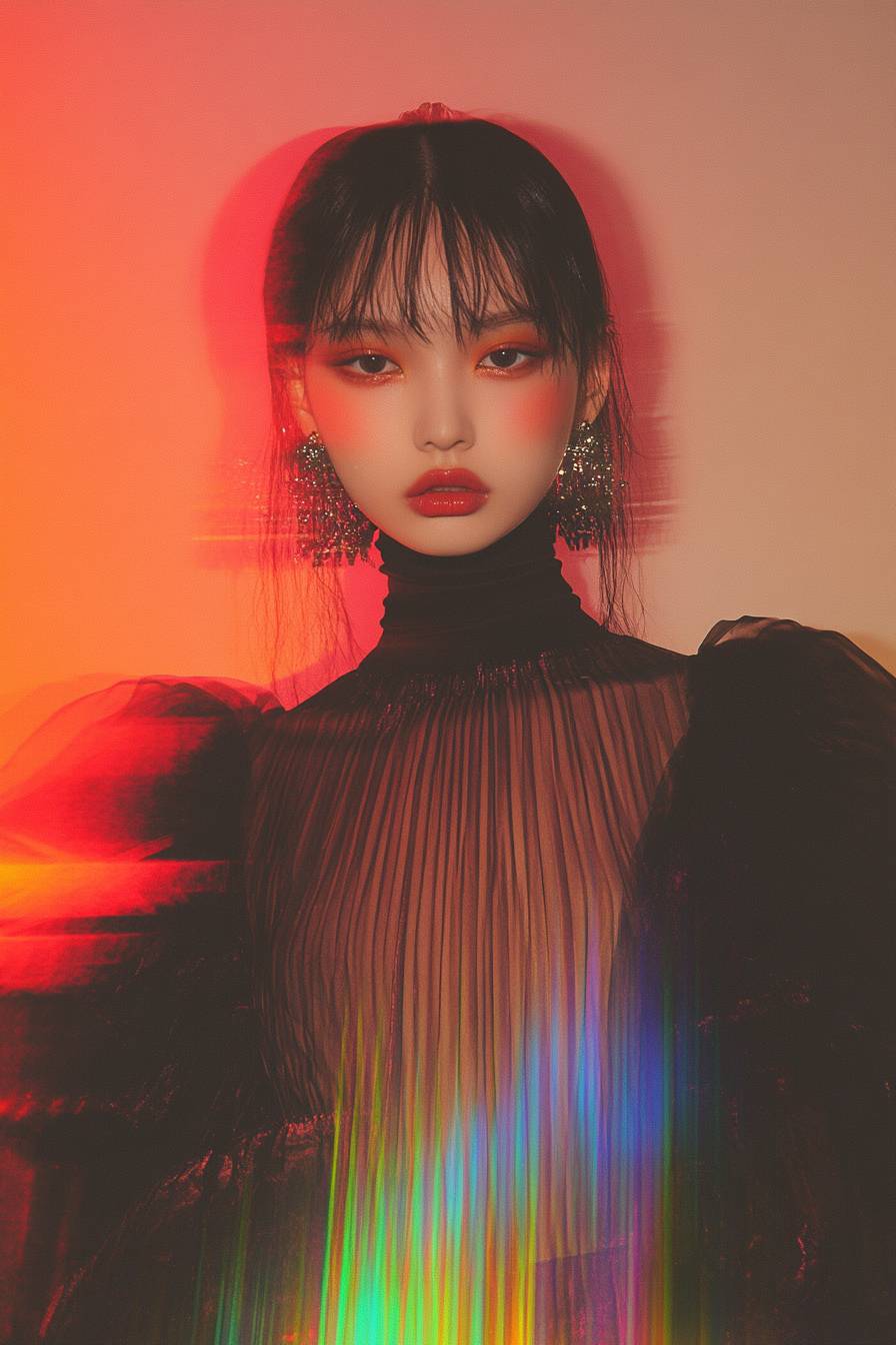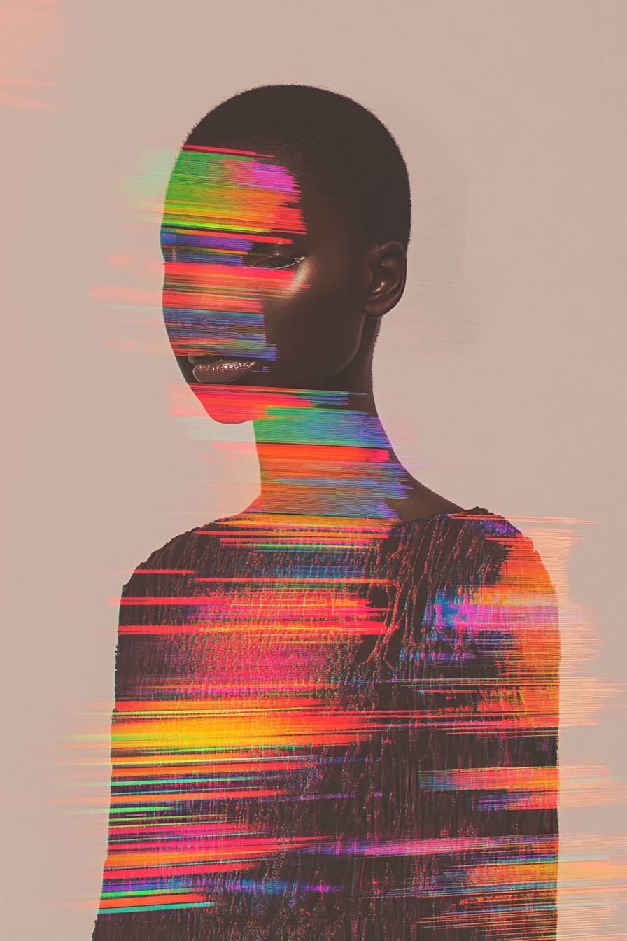 聖羅蘭模特穿著優雅的不對稱連衣裙,半步而立,置身於未來感十足的環境中,強烈的圖形疊加,扭曲的線條,流動的抽象形狀和生動的色彩溅,形成運動效果,背景則是柔和的色調。電影式的燈光投射出微妙的反射和深邃的陰影,特寫鏡頭中有模糊的元素,生動的數字紋理與連衣裙融合,捕捉前衛時尚與故障風格圖形藝術的精髓。