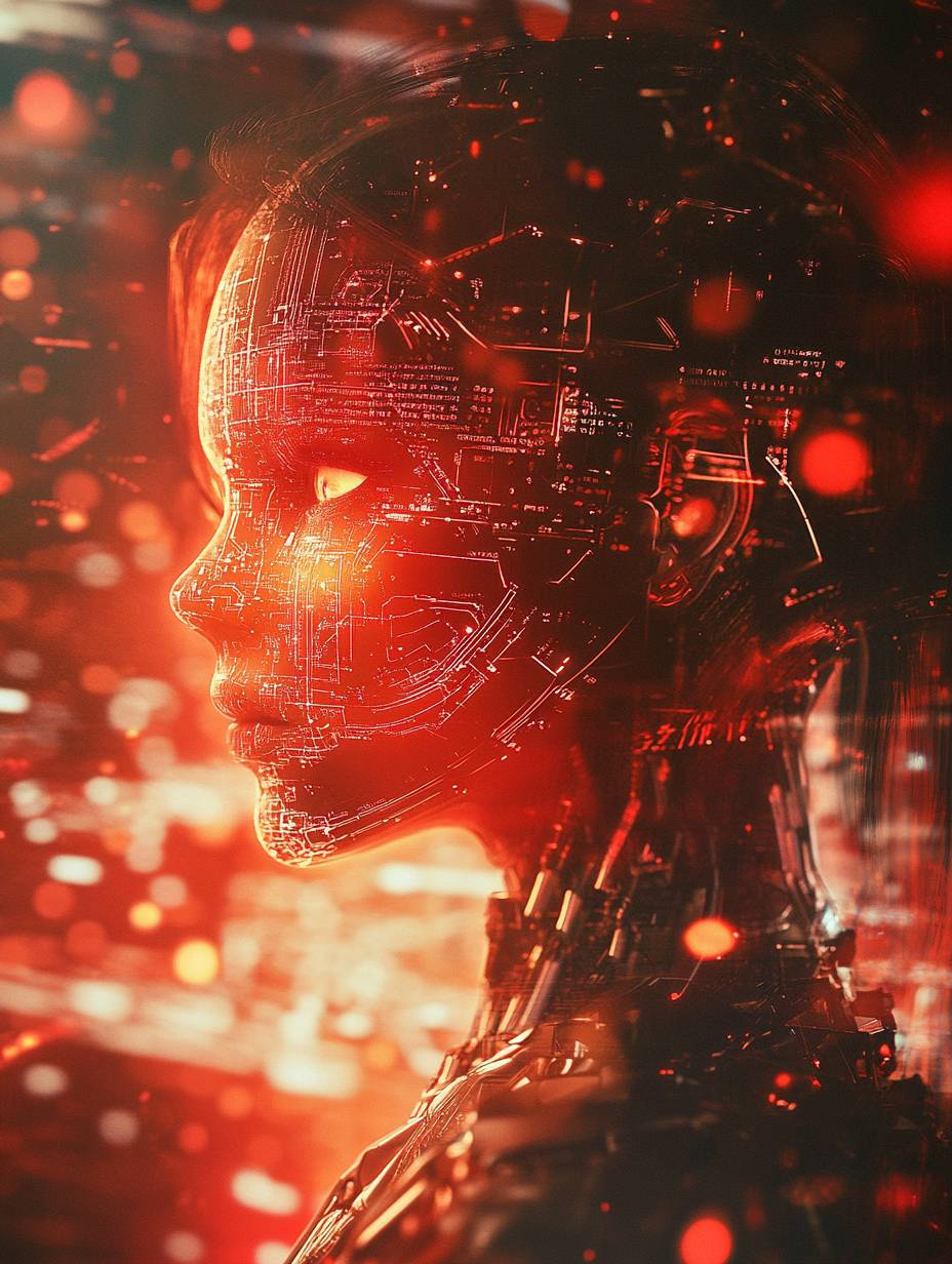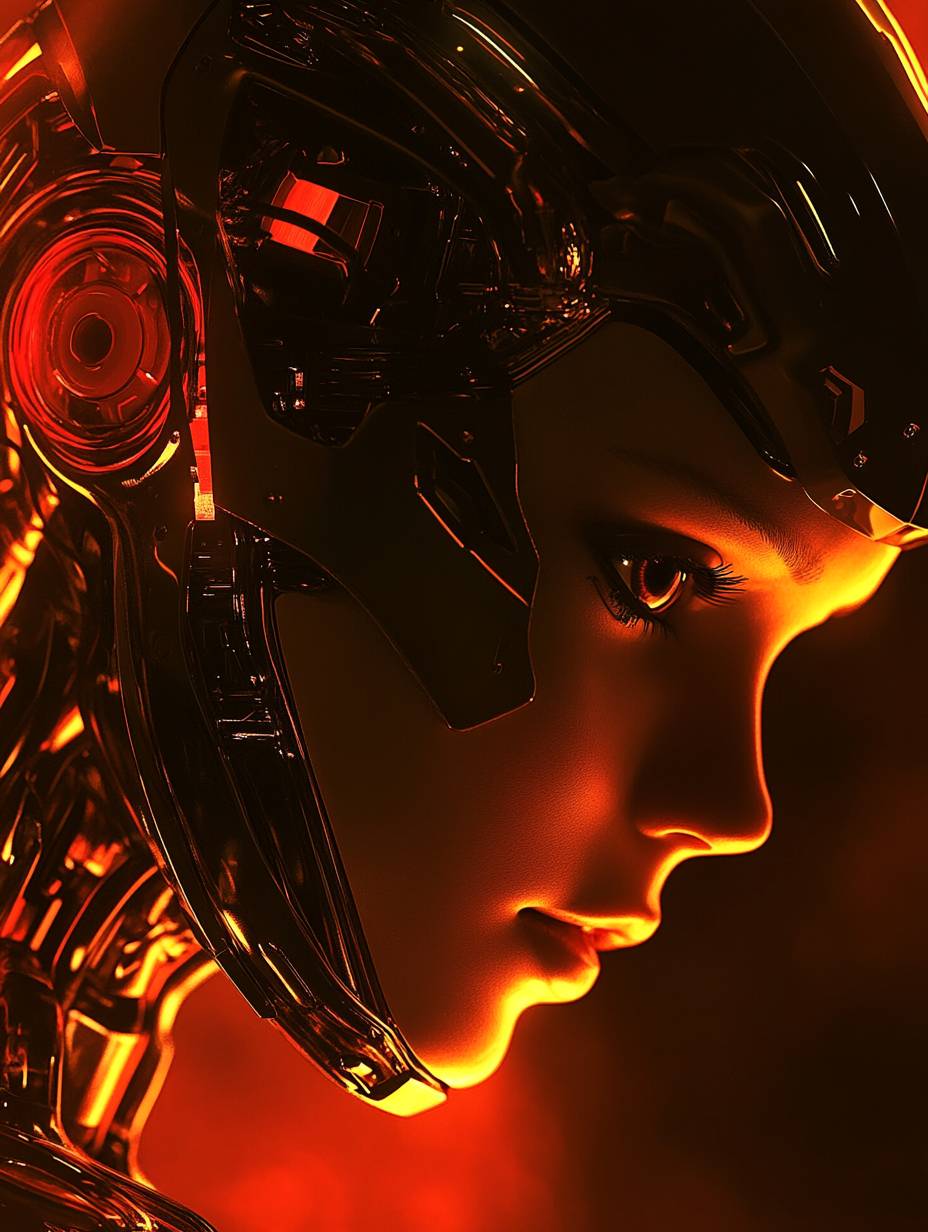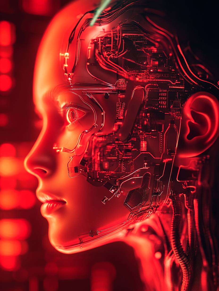一個以人工智能為核心的賽博女孩,體現了科技與人類的融合。她的機械結構被紅光照亮,象徵著未來科幻的能量。