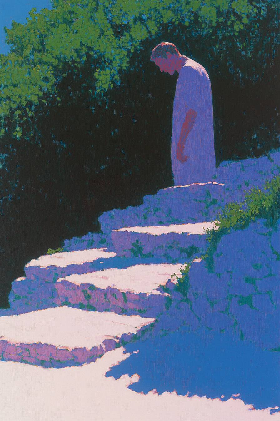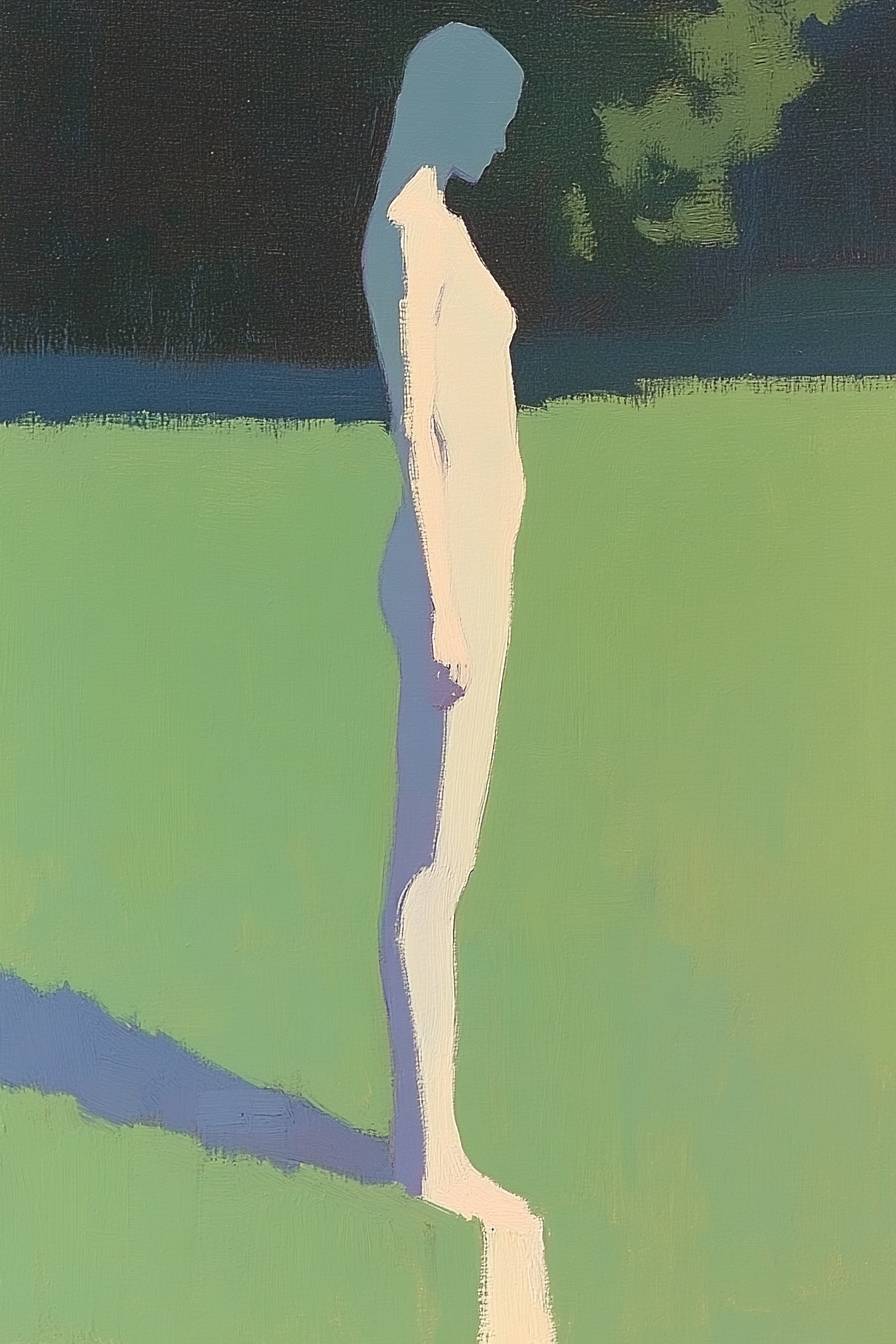 一幅花園的畫作,採用淺綠色和紫色調,具有抽象表現主義風格,包含大片空白區域。人物在陽光下被照亮。畫作具有中心構圖和豐富的細節,使用油畫技法創作。